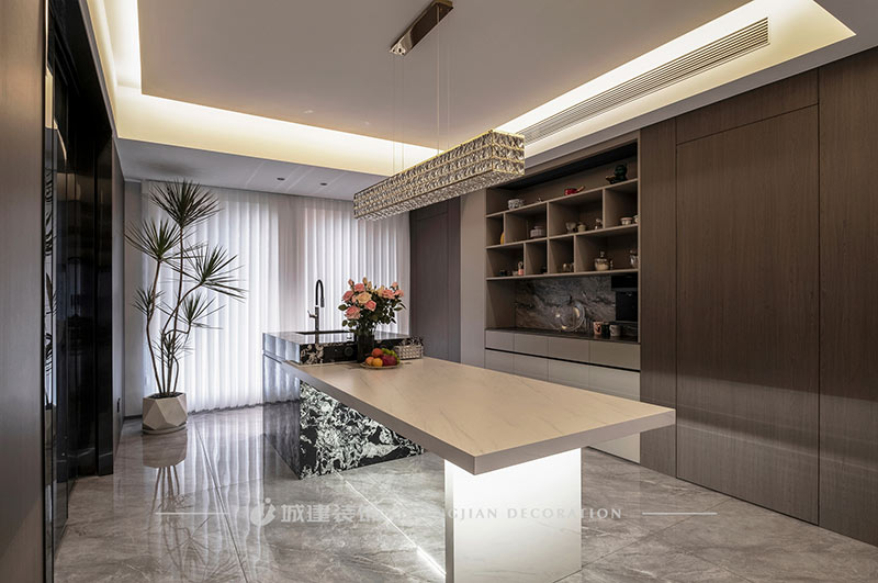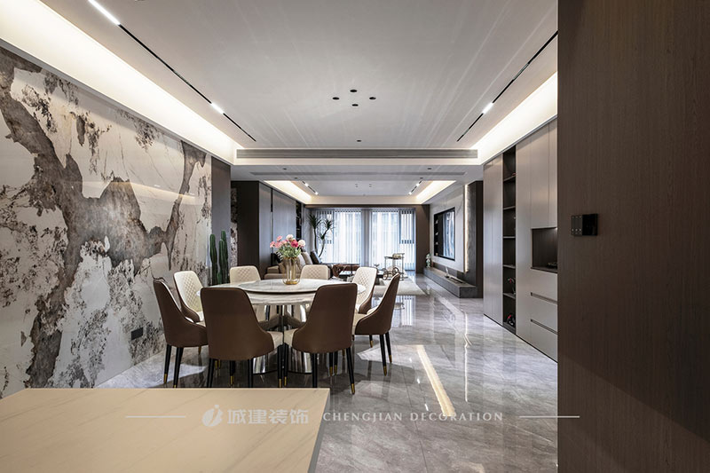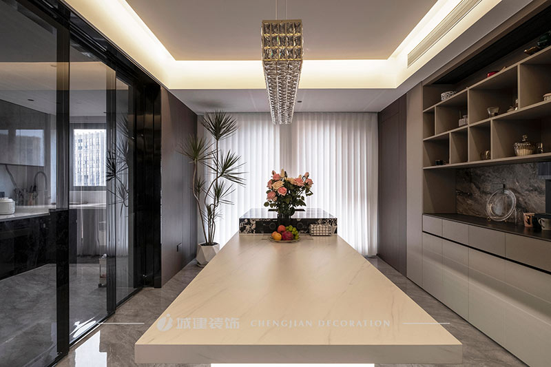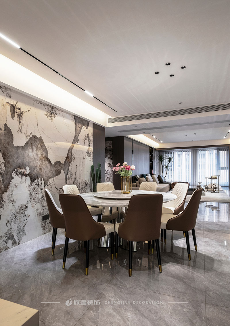 客餐廳陽臺打通,南北進深延展至18m,無主燈設計不壓層高,空間通透明朗,自由愜意的家居生活由此拉開序幕。