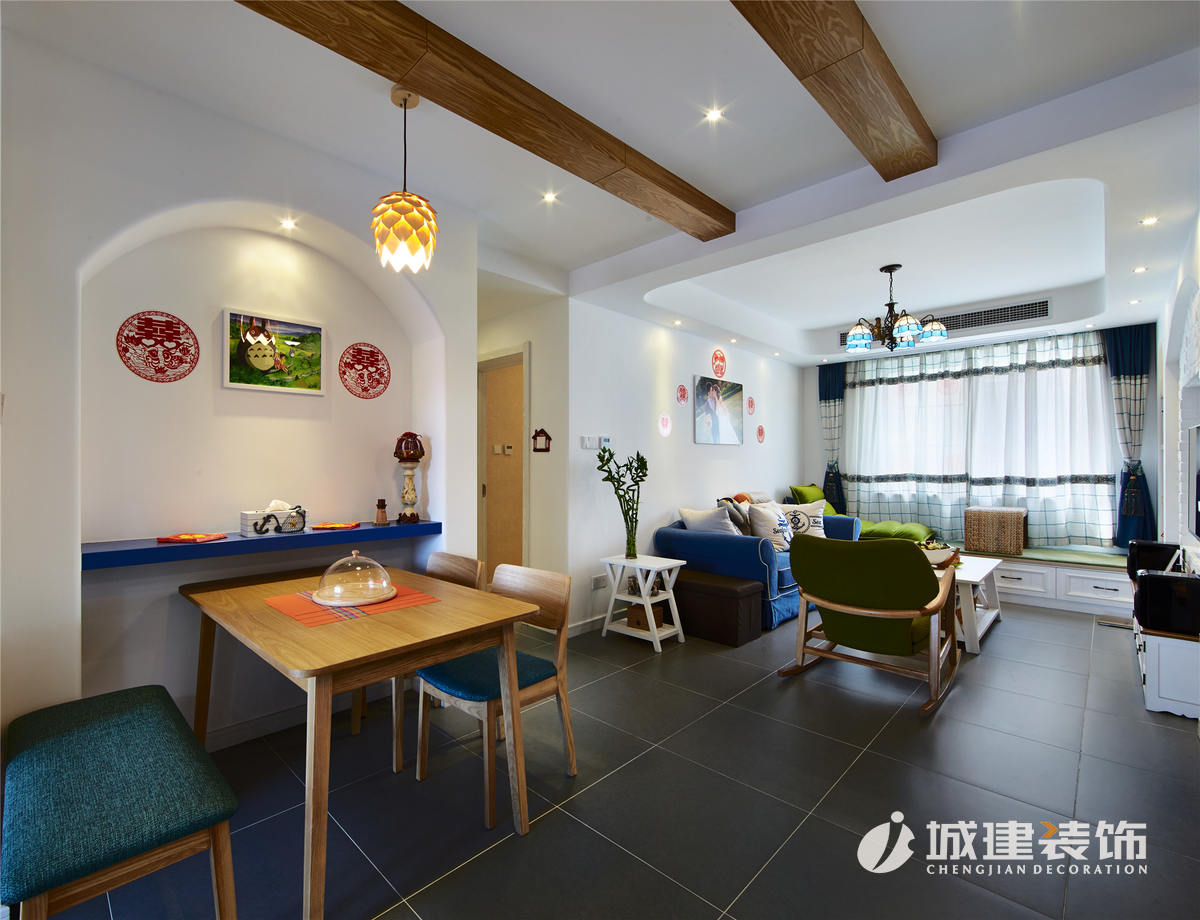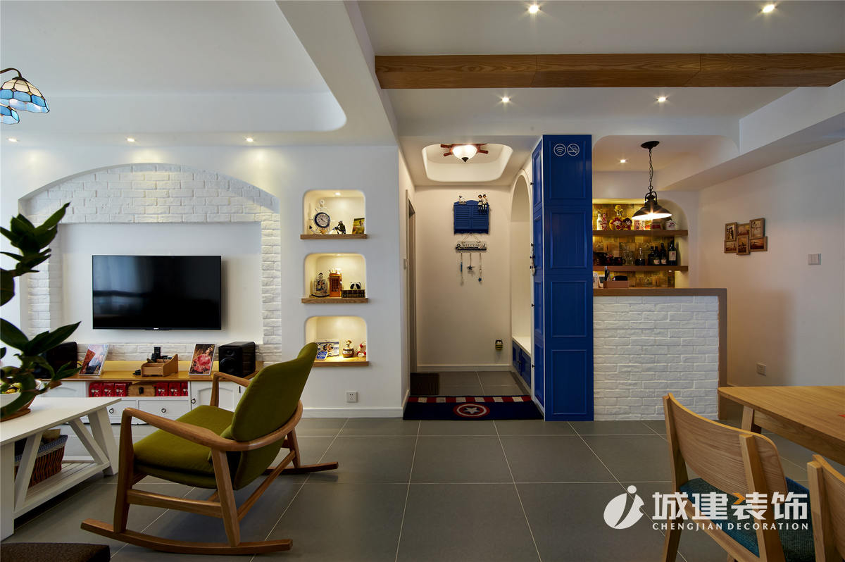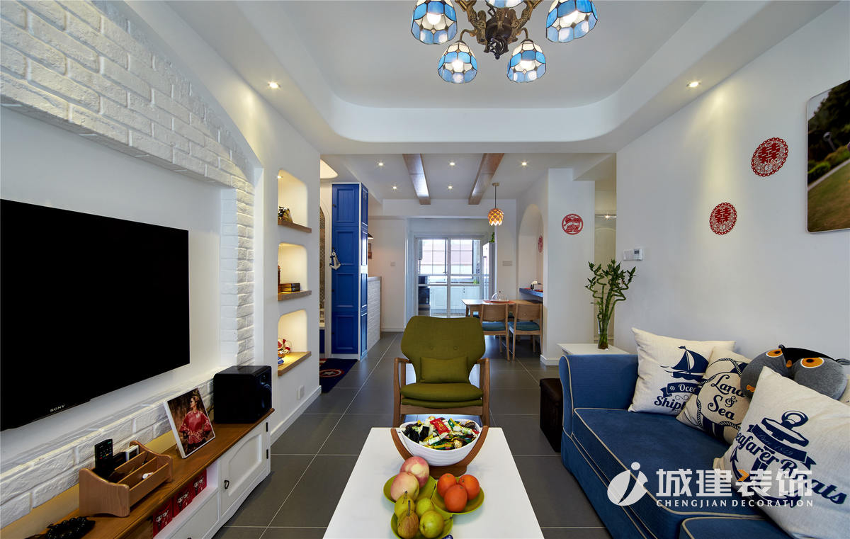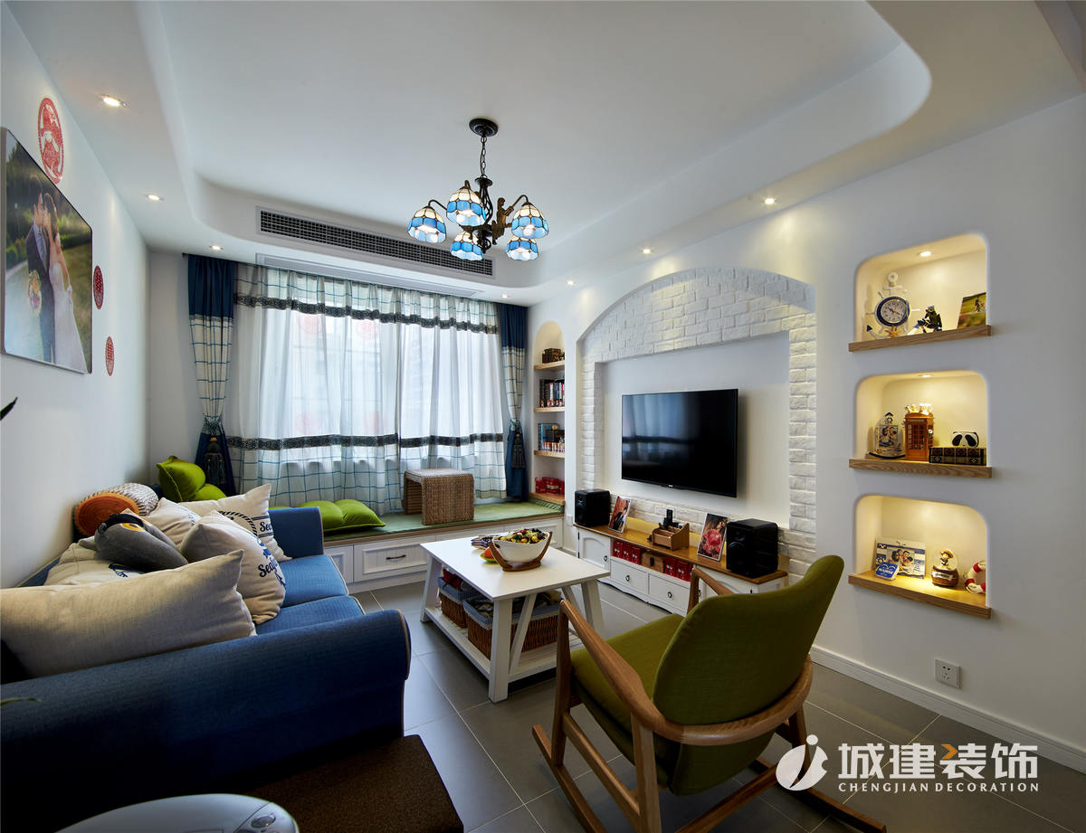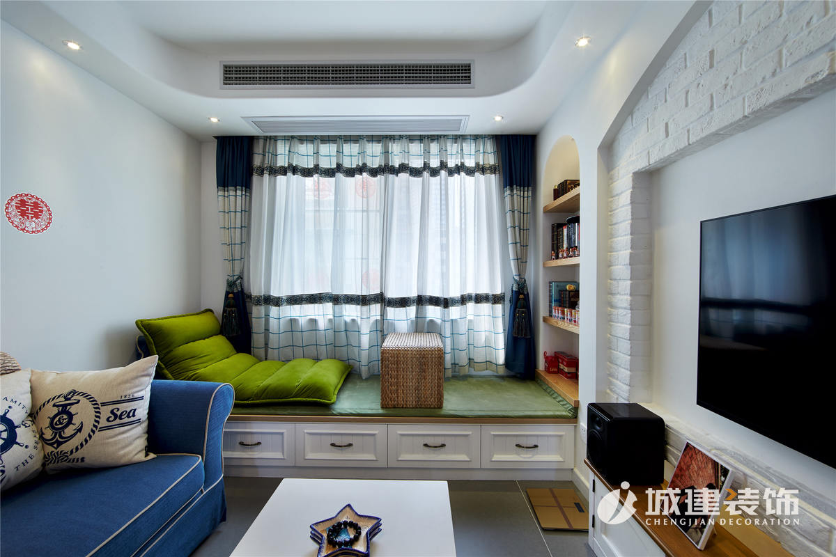 采用藍(lán)白為主題色,家具上采用宜家風(fēng)格。整個設(shè)計大膽創(chuàng)新??蛷d的左邊設(shè)計師做了一個飄窗臺,即使用又美觀。藍(lán)色的沙發(fā),宜家的家具。無一不透露著簡約而時尚。