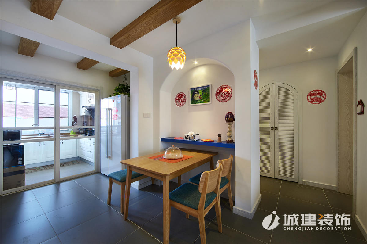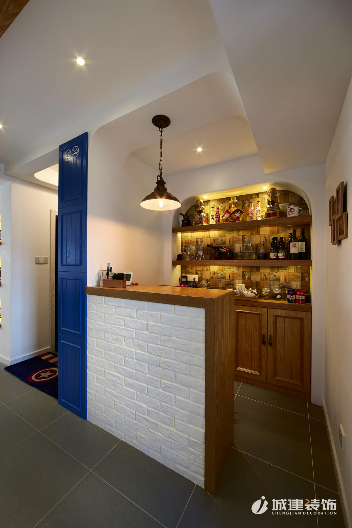 打開門,首先進(jìn)入視線的是充滿濃郁地中海氣息的玄關(guān),柜子采用的藍(lán)色為整個色調(diào)。進(jìn)入房間的左手邊就是一個小小的吧臺,古韻味的設(shè)計絲毫不顯得擁擠,排滿的酒家,以及墻面的照片,都彰顯出業(yè)主是個會生活的人。