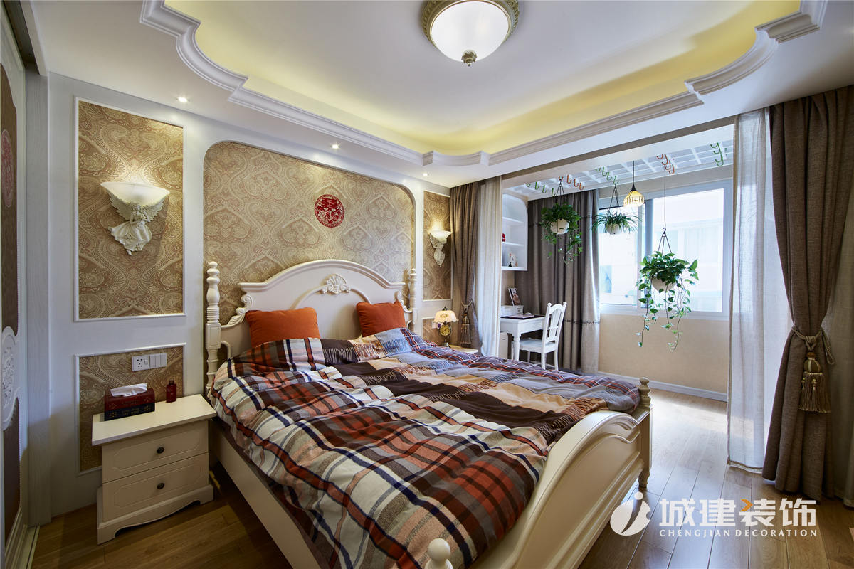 主臥的床頭采用的是復(fù)古的壁紙來搭配床。床的兩邊是小小的床頭柜。簡潔大方,旁邊用窗簾隔離出了一個小小的辦公區(qū)域,上方掛滿了綠色植物。讓辦公都變得有趣起來。次臥是一間充滿了童趣的房間,很是簡約,自然。