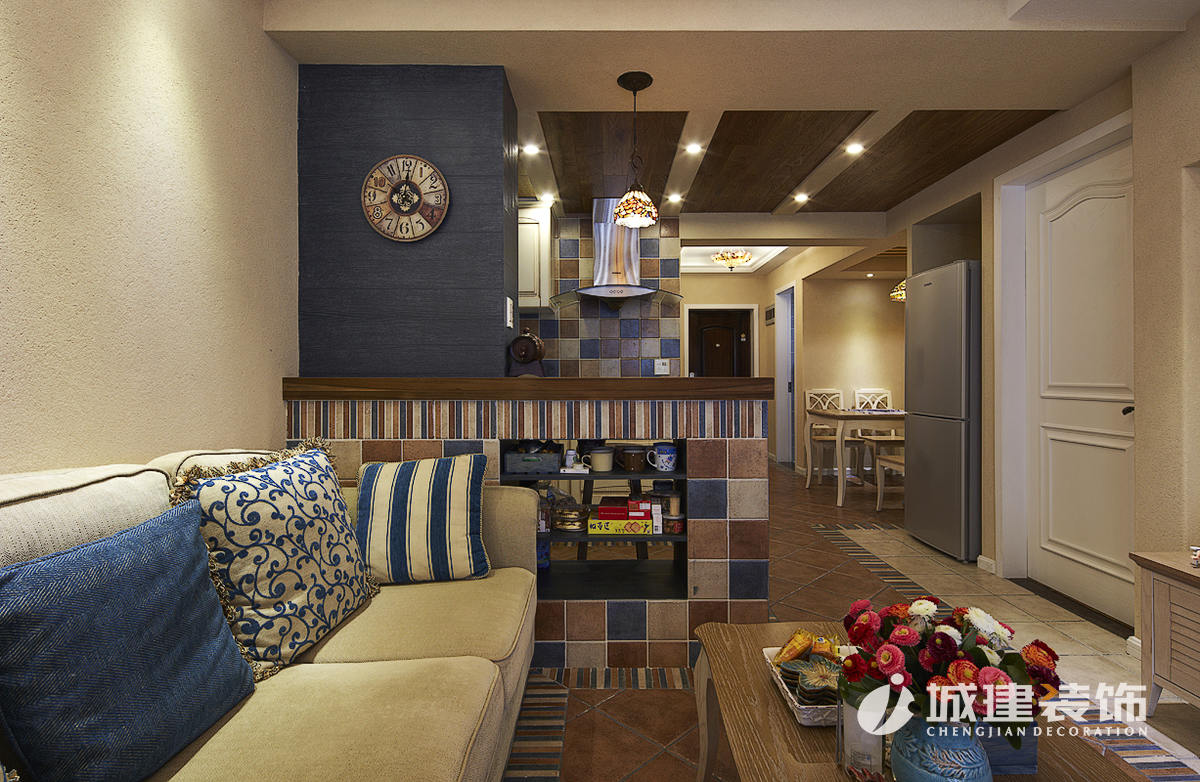 入戶右手邊經(jīng)設(shè)計(jì)改為次臥,頂天立地的大儲(chǔ)物柜是小戶裝修的福音,左手邊衛(wèi)浴間與主臥地走道間隔出了餐廳一角。敞開(kāi)式廚房無(wú)論從視覺(jué)性還是使用性來(lái)看,空間都變得寬敞明亮了許多,吧臺(tái)式紅酒柜也獨(dú)具風(fēng)味。連接客廳與陽(yáng)臺(tái)間的拱型與電視背景墻強(qiáng)烈呼應(yīng),形成地中海風(fēng)味的標(biāo)志物。陽(yáng)臺(tái)兩側(cè)分做儲(chǔ)物柜,配上業(yè)主自己種的花草,不失為溫馨舒適的休閑一隅。