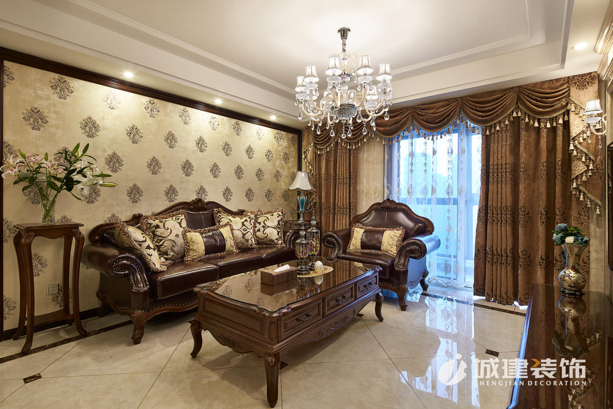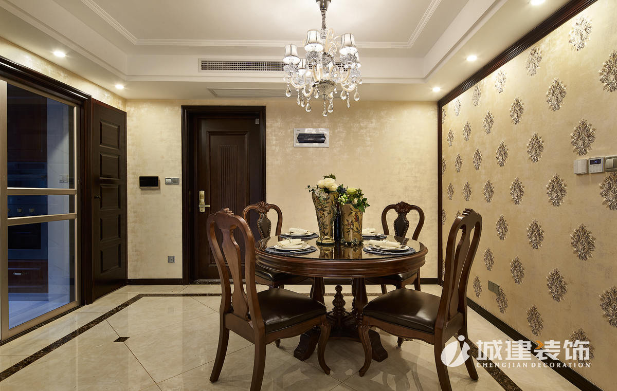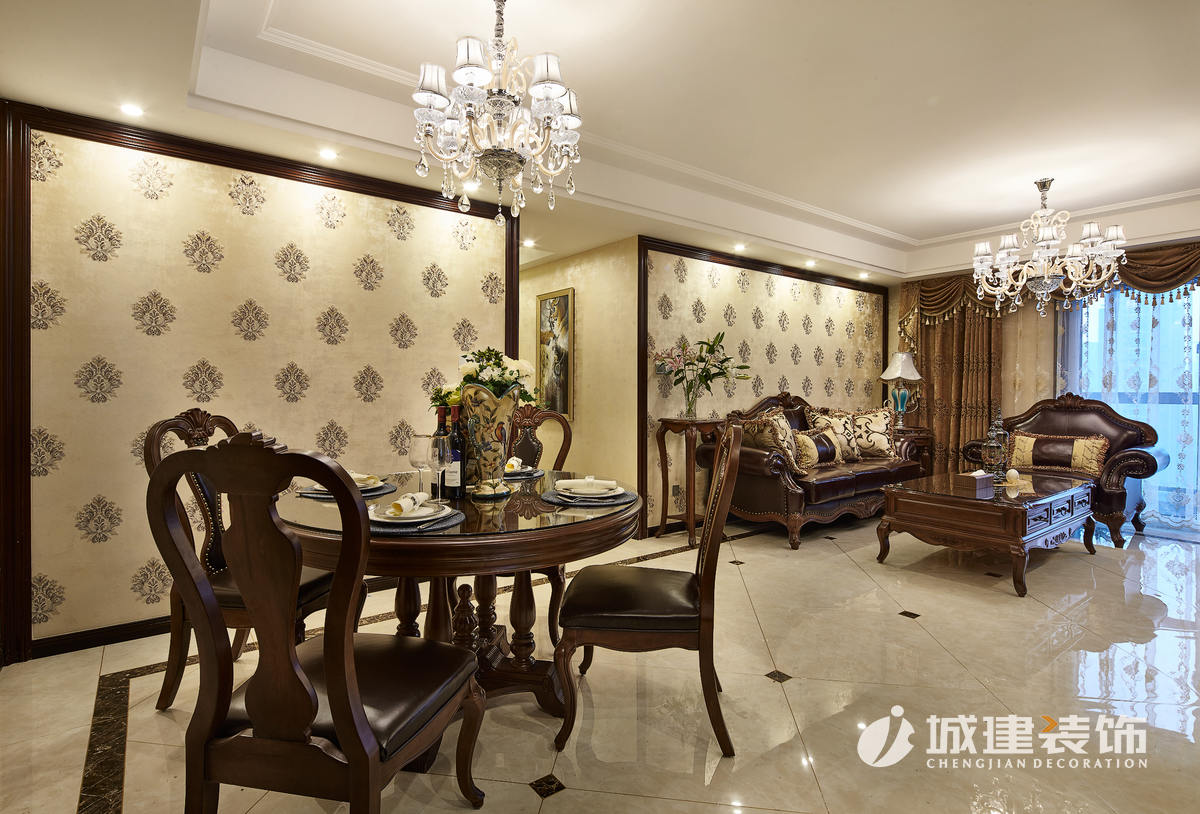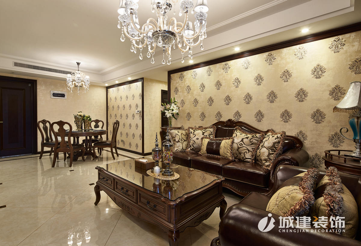 入戶映入眼簾的就是沉穩(wěn)大氣的客餐廳區(qū)域,空間整體以金黃系列為主色調(diào),選用的石材、壁紙、軟包都相得益彰。深色系的實木真皮沙發(fā),選用同款花紋的窗簾和壁紙,無不體現(xiàn)尊貴典雅的氣息。
