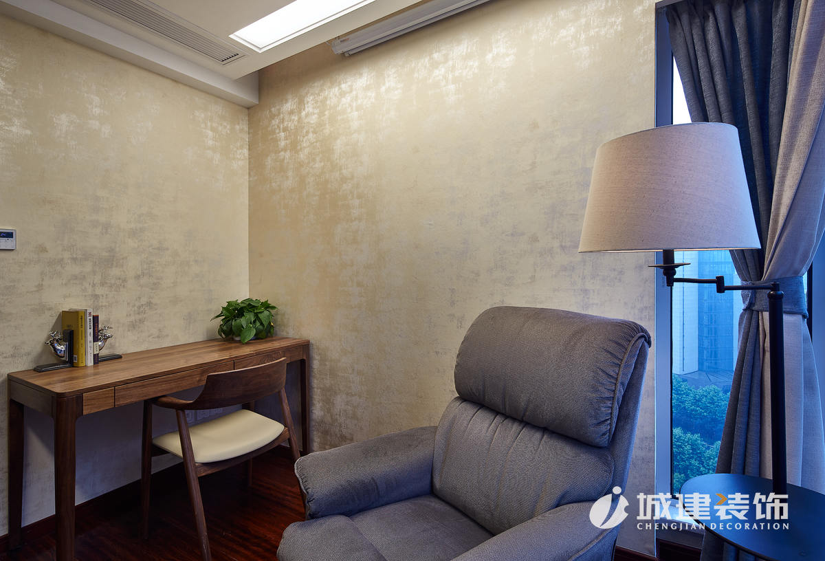 由客餐廳區(qū)域為中心,左右分別延伸至?xí)亢椭髋P,與過道處統(tǒng)一采用金砂壁紙,低調(diào)而華貴,空間上也得到很好地承接。