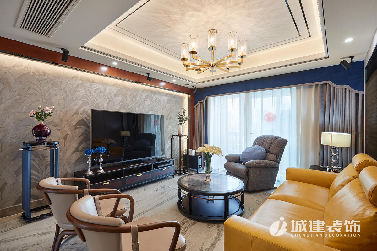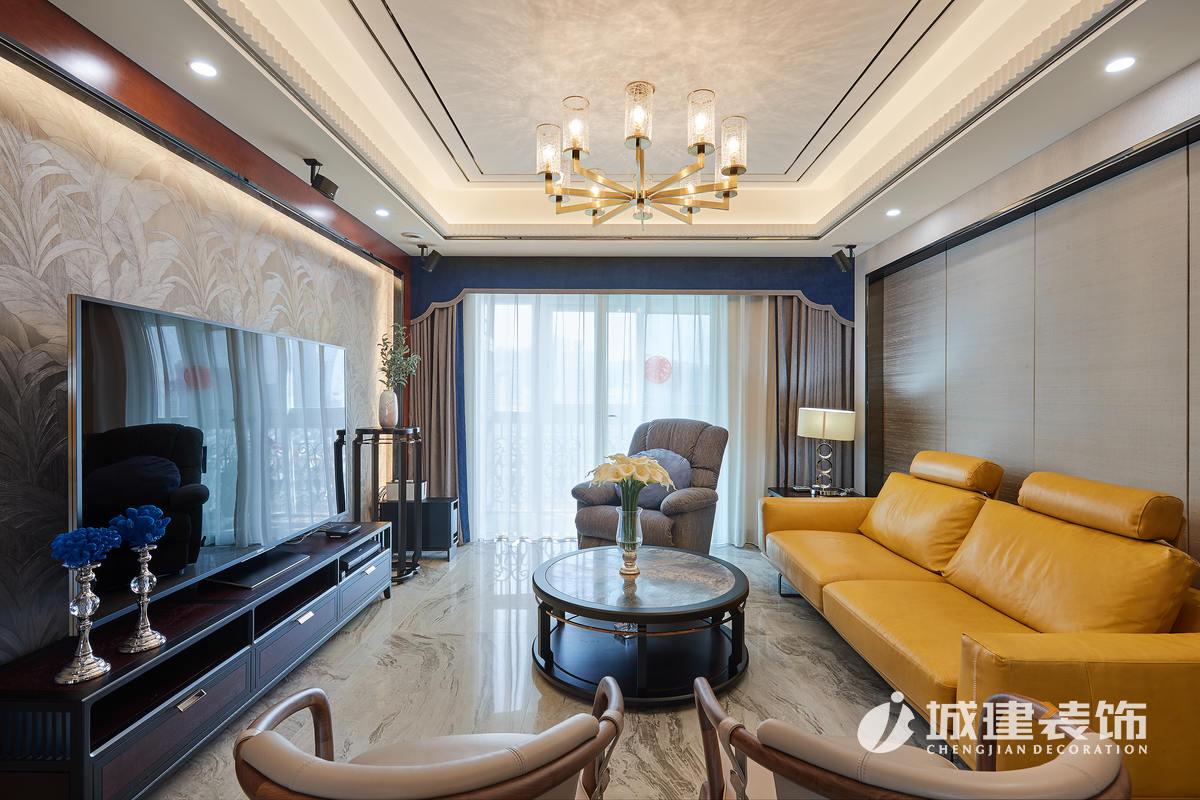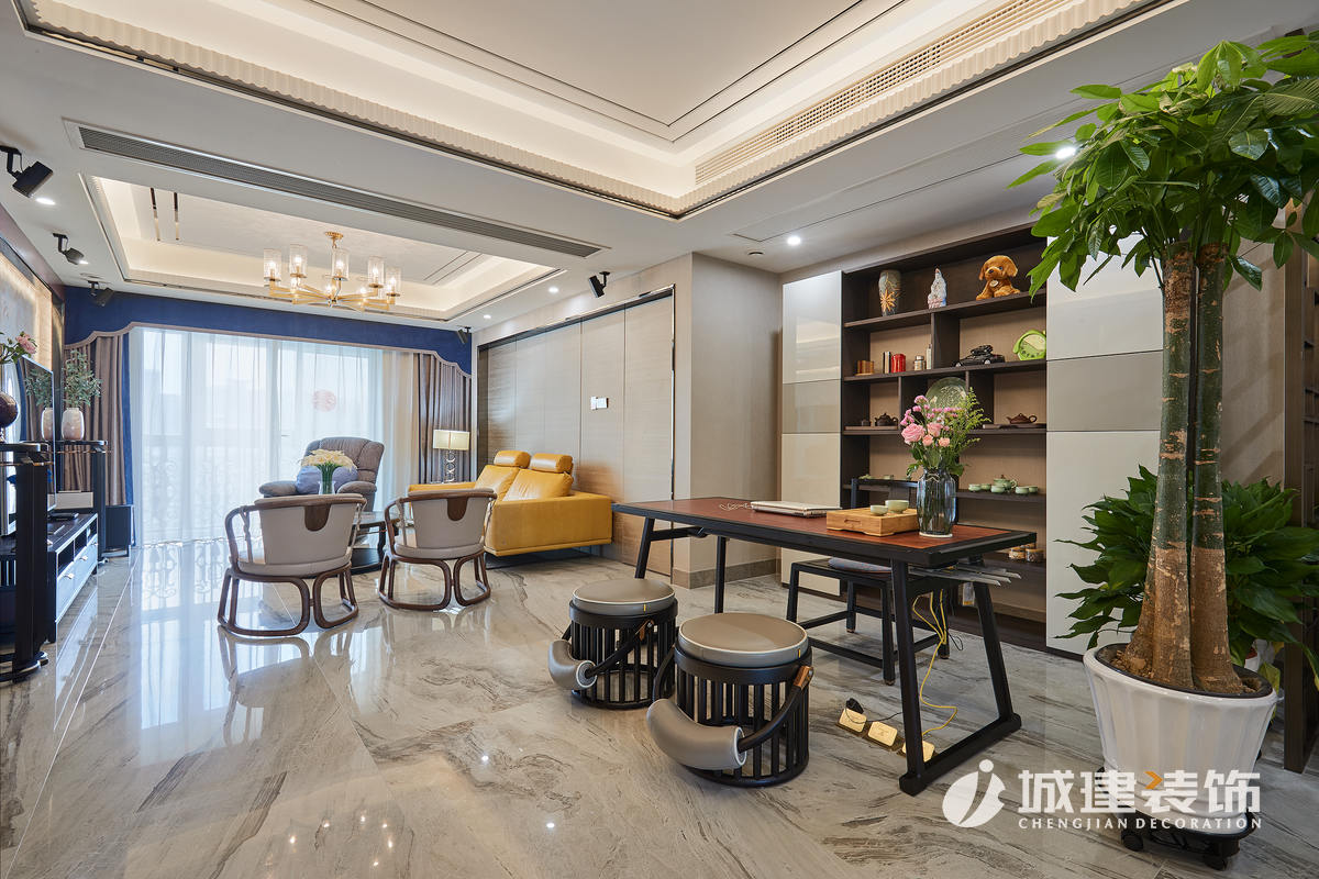 此空間利用吊頂自然劃分為客廳與休閑吧兩個(gè)區(qū)域。乍一看,簡約的線條,簡潔的裝飾,現(xiàn)代風(fēng)無疑,但仔細(xì)一品,金屬鑲邊更像畫框,而地面花紋就是一副寫意的水墨畫,家具也都蘊(yùn)藏著中式元素?,F(xiàn)代新中式掙脫了傳統(tǒng)中式的厚重,但保留了底蘊(yùn),卻更自由。