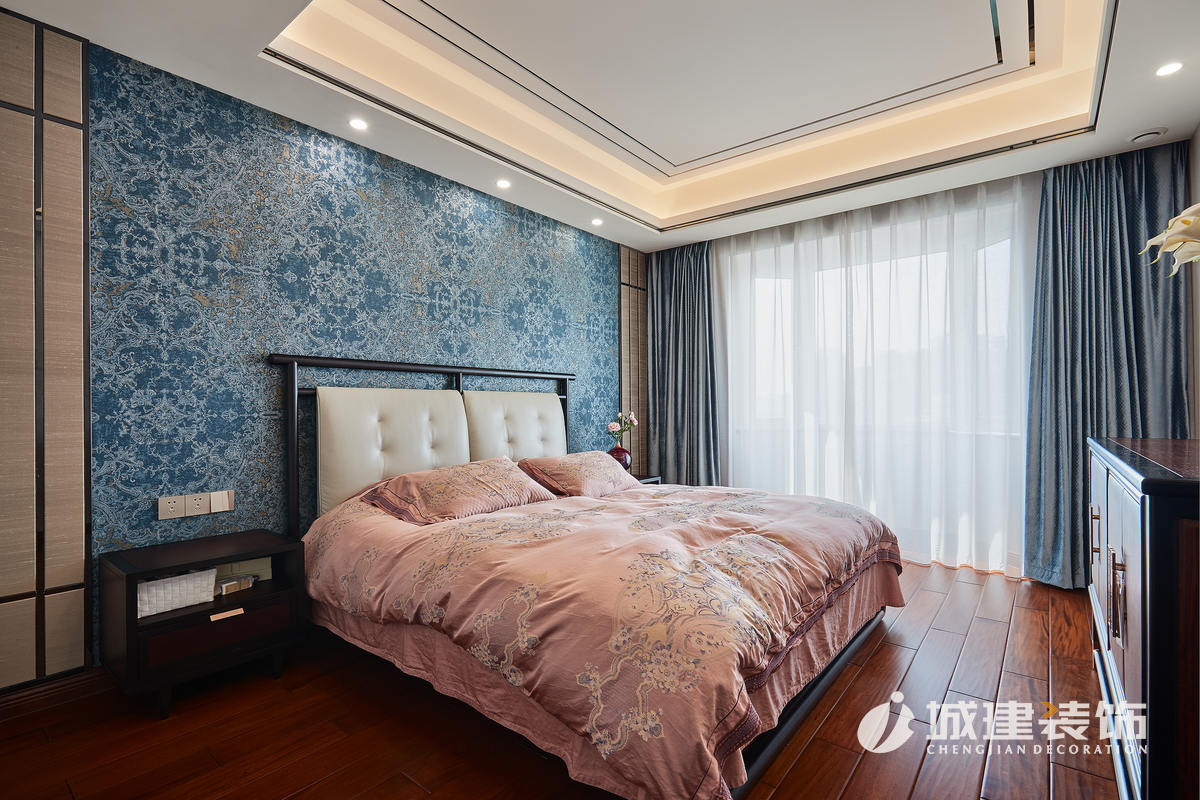 主臥如中國瓷器的背景墻,與精致的古風(fēng)儲(chǔ)物柜相對(duì)應(yīng),窗簾選色也呼應(yīng)著,讓這個(gè)空間的氛圍靜謐溫柔。