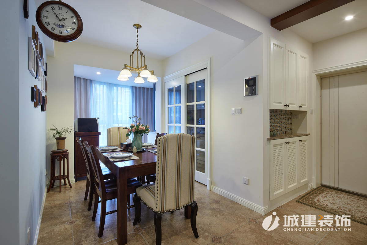 本案原戶型三室兩廳兩衛(wèi)結(jié)構(gòu),設(shè)計的最大亮點在于餐廳,原戶型結(jié)構(gòu)上這處有一隔斷墻,經(jīng)設(shè)計后直接敲掉,納入餐廳區(qū)域,功能性增強的同時也讓客餐廳兩點一線,南北空間變得十分通透。