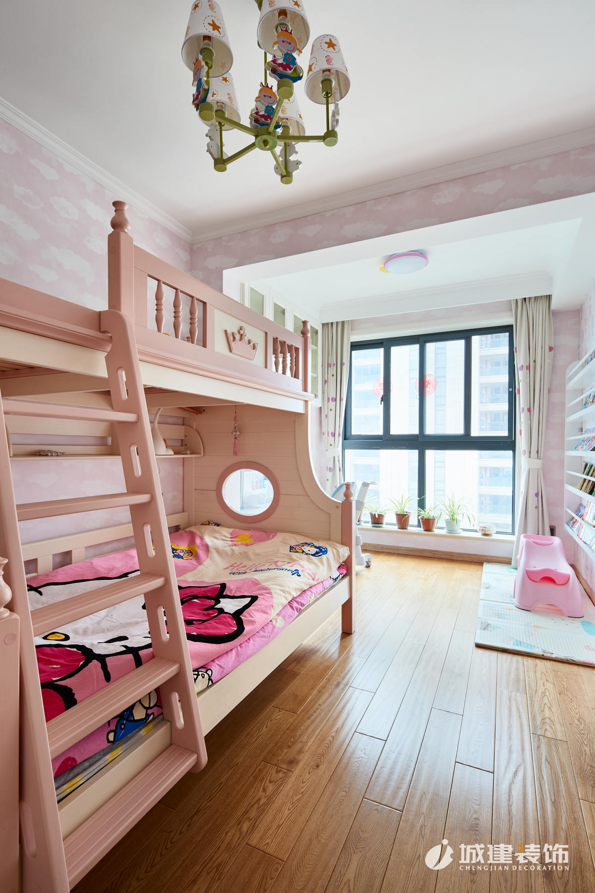 兒童房采用上下鋪,夢幻的墻布加上粉紅色,讓少女氣息撲面而來。