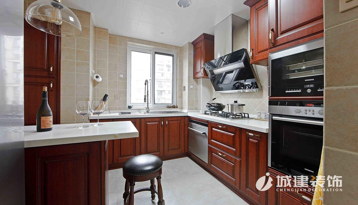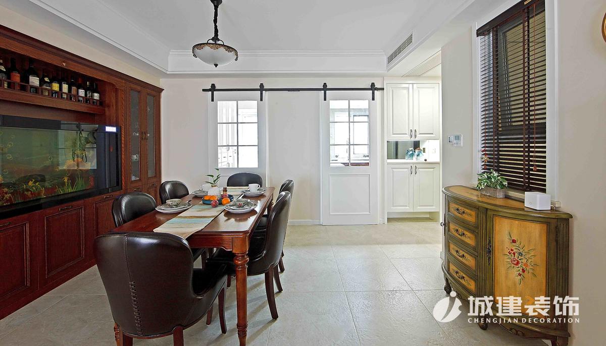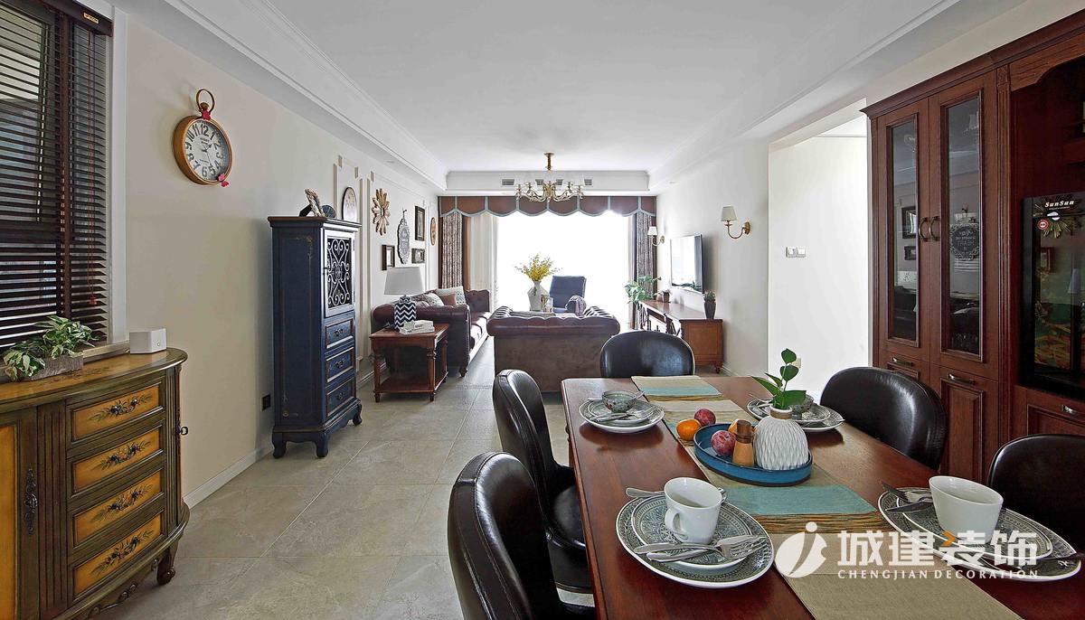 客餐廳以米色基調(diào)為主,沙發(fā)茶幾電視柜餐桌等家具則以深色系為主,使整個空間相當(dāng)飽滿,再加上形狀不一的各類掛飾的烘托,很好地展示了美式風(fēng)格的特色,更讓整個家顯得溫馨舒適。