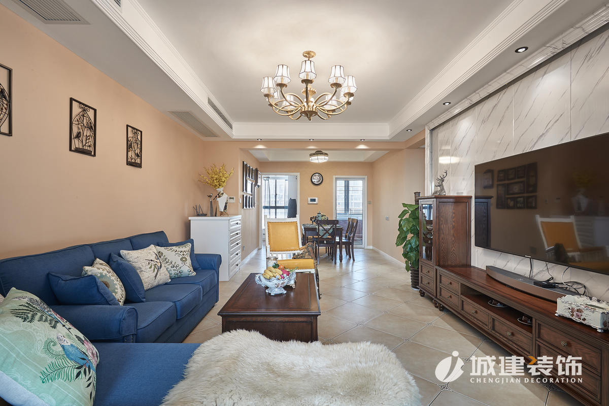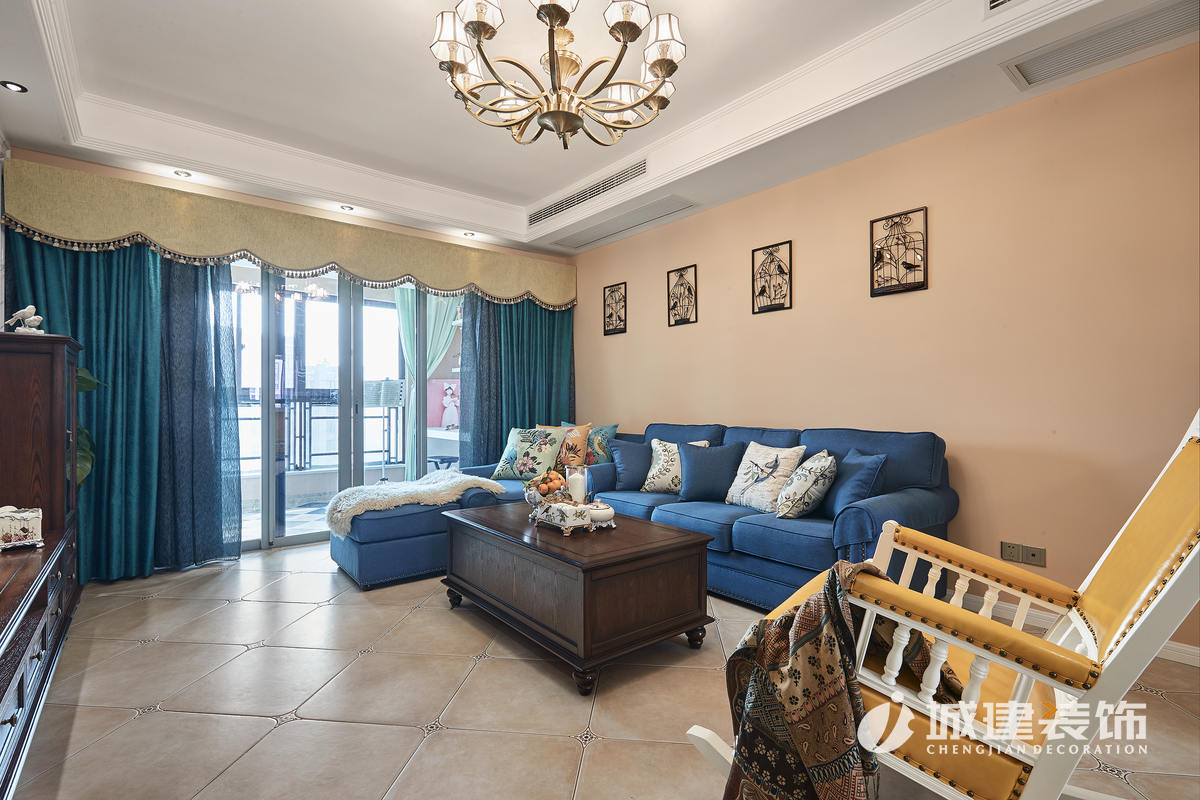 本案清新澄朗,仿佛一腳踏入森林,鳥飛蟬鳴都依稀可聞,藍(lán)白相輝映,復(fù)古里面夾雜著小清新,不落俗套的搭配??蛷d與門廳之間的色彩關(guān)系,材質(zhì)的變化,讓空間稍顯靈動(dòng)。