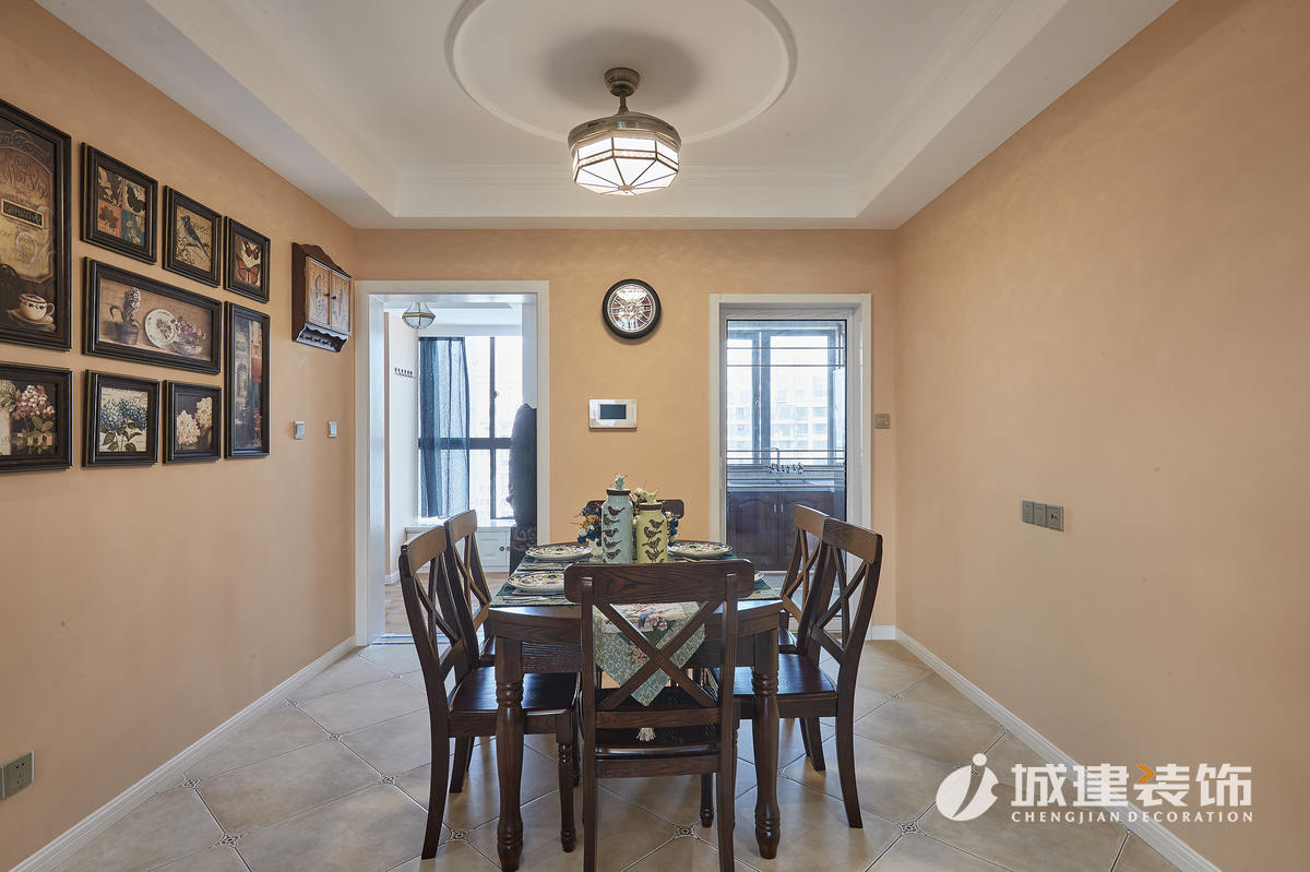 選擇了深色的方形木桌,一家人圍坐在一起吃飯是最溫馨的,餐廳桌椅顏色材質(zhì)與墻面掛畫呼應(yīng),所有人來到這個(gè)空間肯定能記住這樣的一排畫。