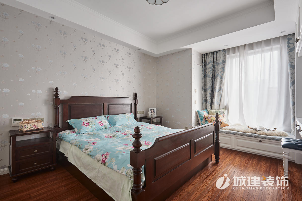 臥室深色實(shí)木家具搭配淺色的墻紙,空間清爽不沉悶,整墻的白色衣柜將陽光漫射到整個(gè)房間。