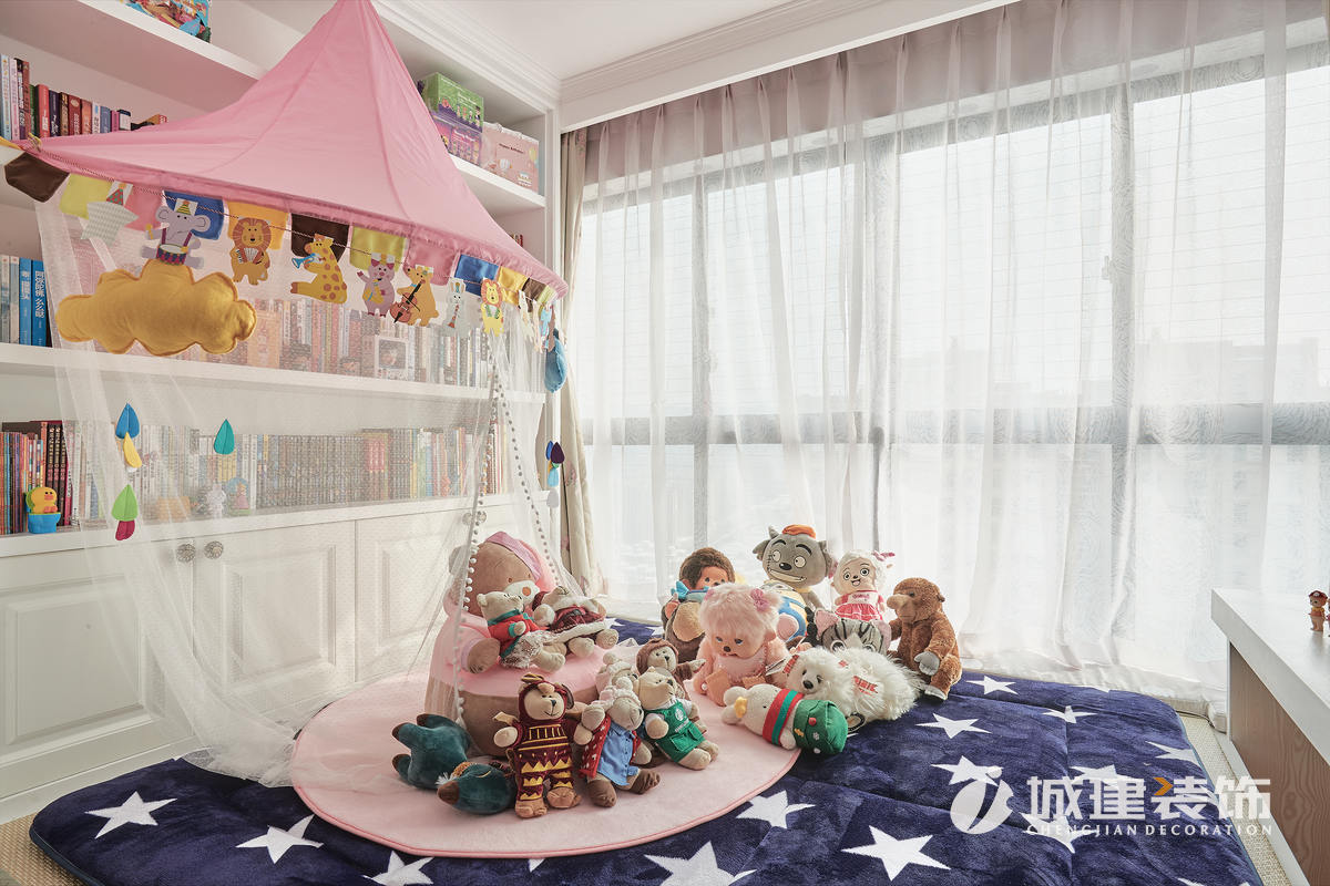 女兒房滿懷公主情懷,公主粉,藍(lán)色等一系列馬卡龍色,讓這間小小的兒童房充滿著甜蜜溫馨。房間里的玩偶,杯子都是女主人淘來的,充滿了童真和愛意。