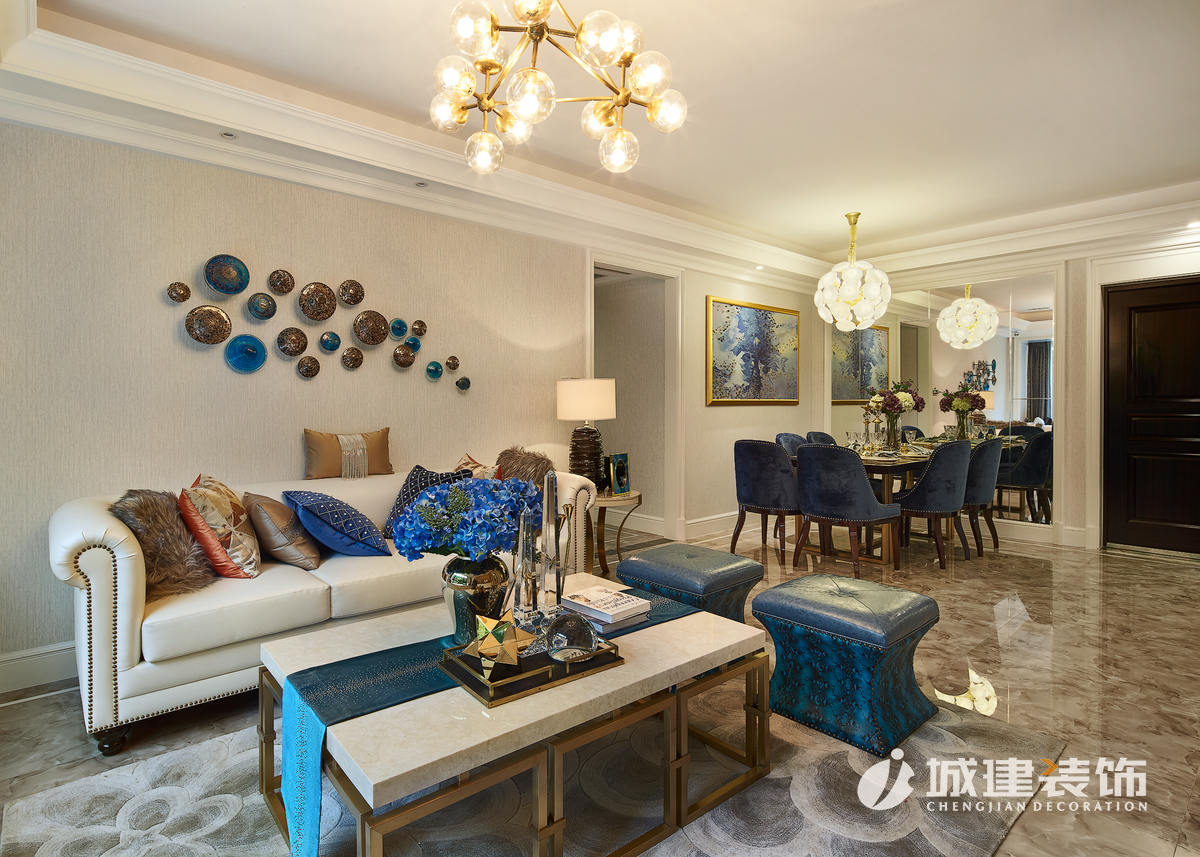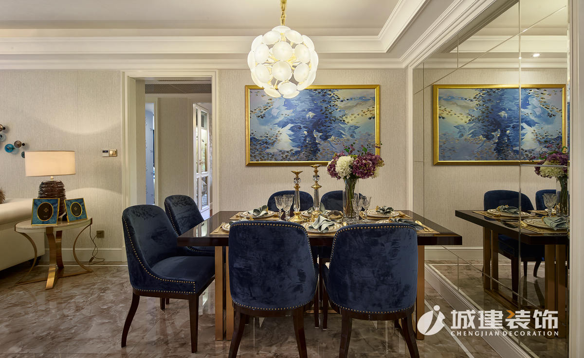 餐廳講究一種飲食的氛圍,設(shè)計(jì)師著重做了細(xì)節(jié)的雕刻,抽象而大氣的油畫(huà),鑲著金邊。同時(shí),為了與整體色系配合,選用了藍(lán)色的高背餐椅精致的餐具,體現(xiàn)的女主人對(duì)生活的高品質(zhì)要求。