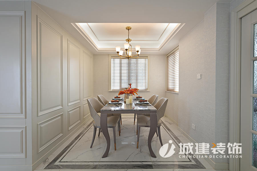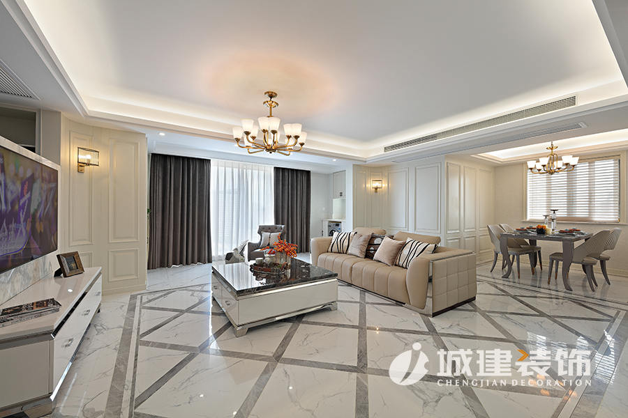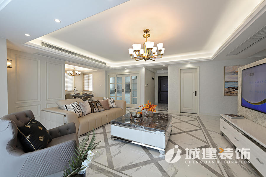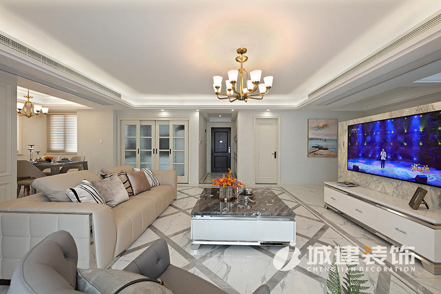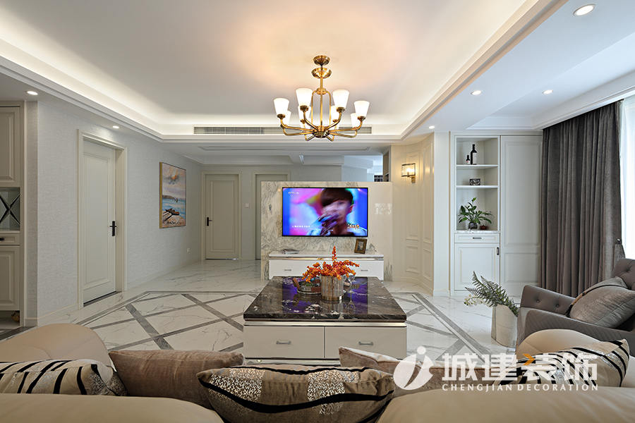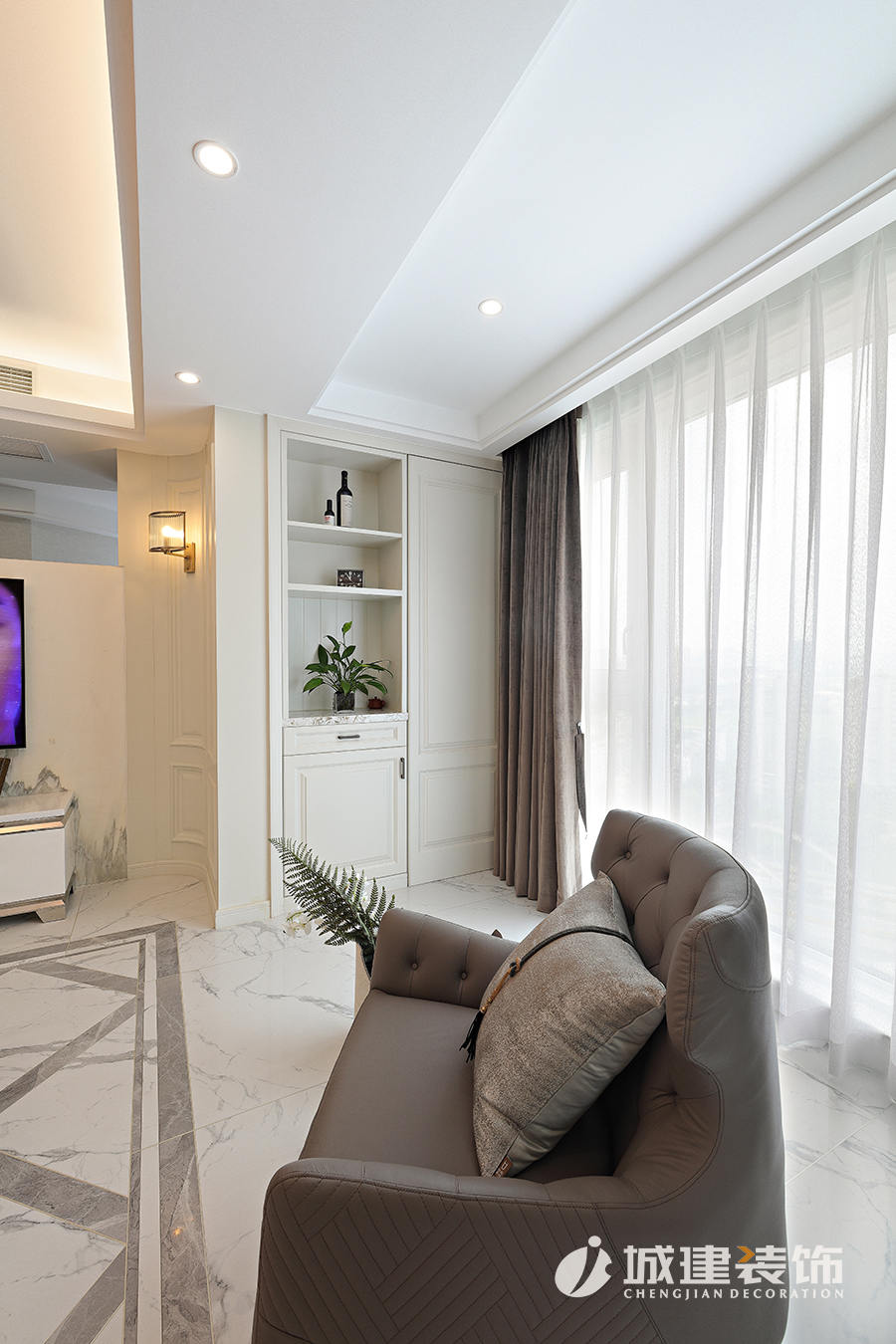 近而不浮,遠而不盡。白色為主色調(diào),營造了一個純凈的氛圍,若隱若現(xiàn)的室外景觀給人以遐想,電視背景墻山水中式元素與現(xiàn)代材質(zhì)巧妙兼容,再現(xiàn)了移步變景的精妙小品。大面積白色造型墻與灰色墻紙搭配,沉穩(wěn)氣息撲面而來,半高電視墻巧妙地利用了墻體的空間,使空間看上去更為寬敞,茶幾黑色的大理石材磚讓這個空間顯得更加沉穩(wěn)。黑色大理石臺面和周圍燈具金色金屬質(zhì)感結(jié)合完美的和電視墻完美呼應(yīng),賦予空間溫暖的質(zhì)感。