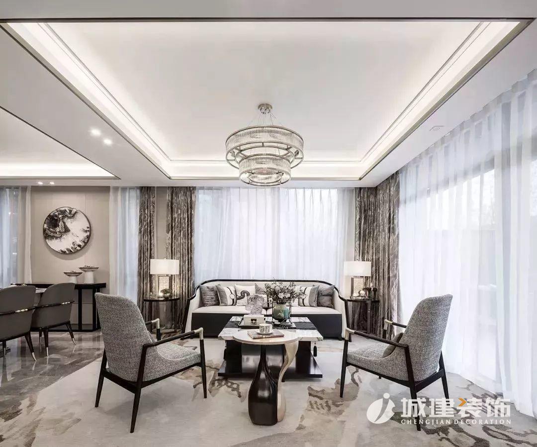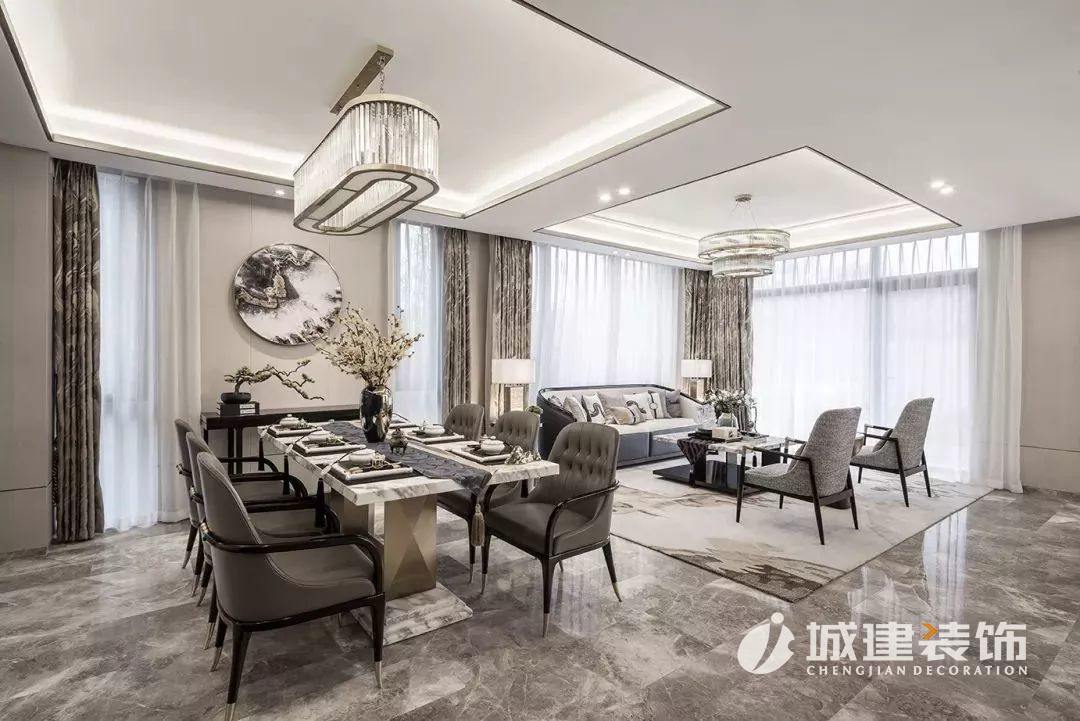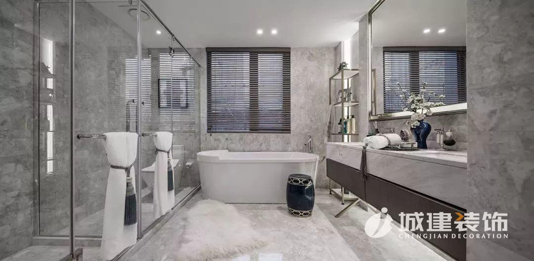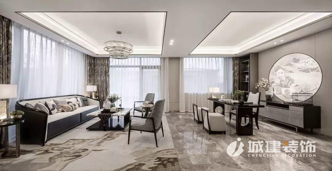 選用的是潑墨天然石材,石材本身呈現(xiàn)出水墨質(zhì)感,呼應(yīng)東方韻味。墻面上切割出的條形燈帶的做法,同樣是大膽的嘗試,更是考驗(yàn)了施工工藝的精度
