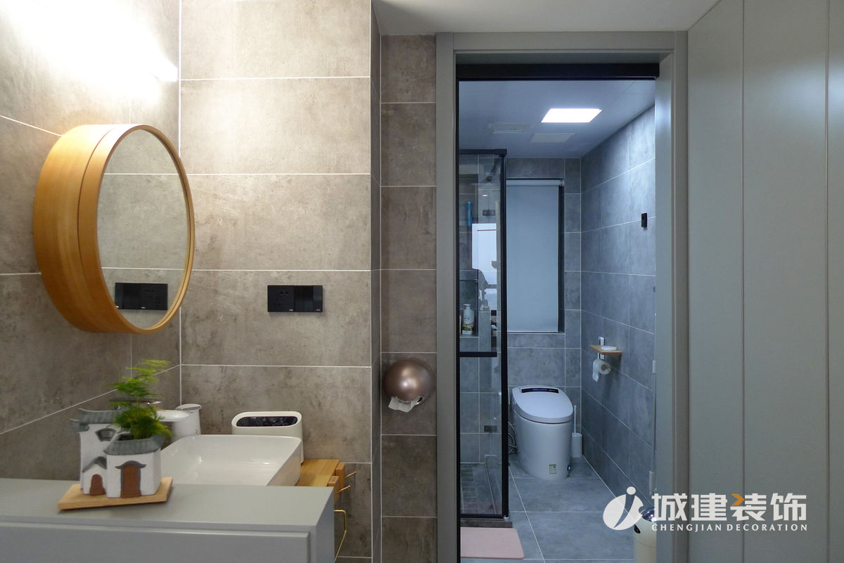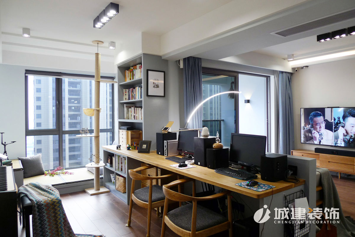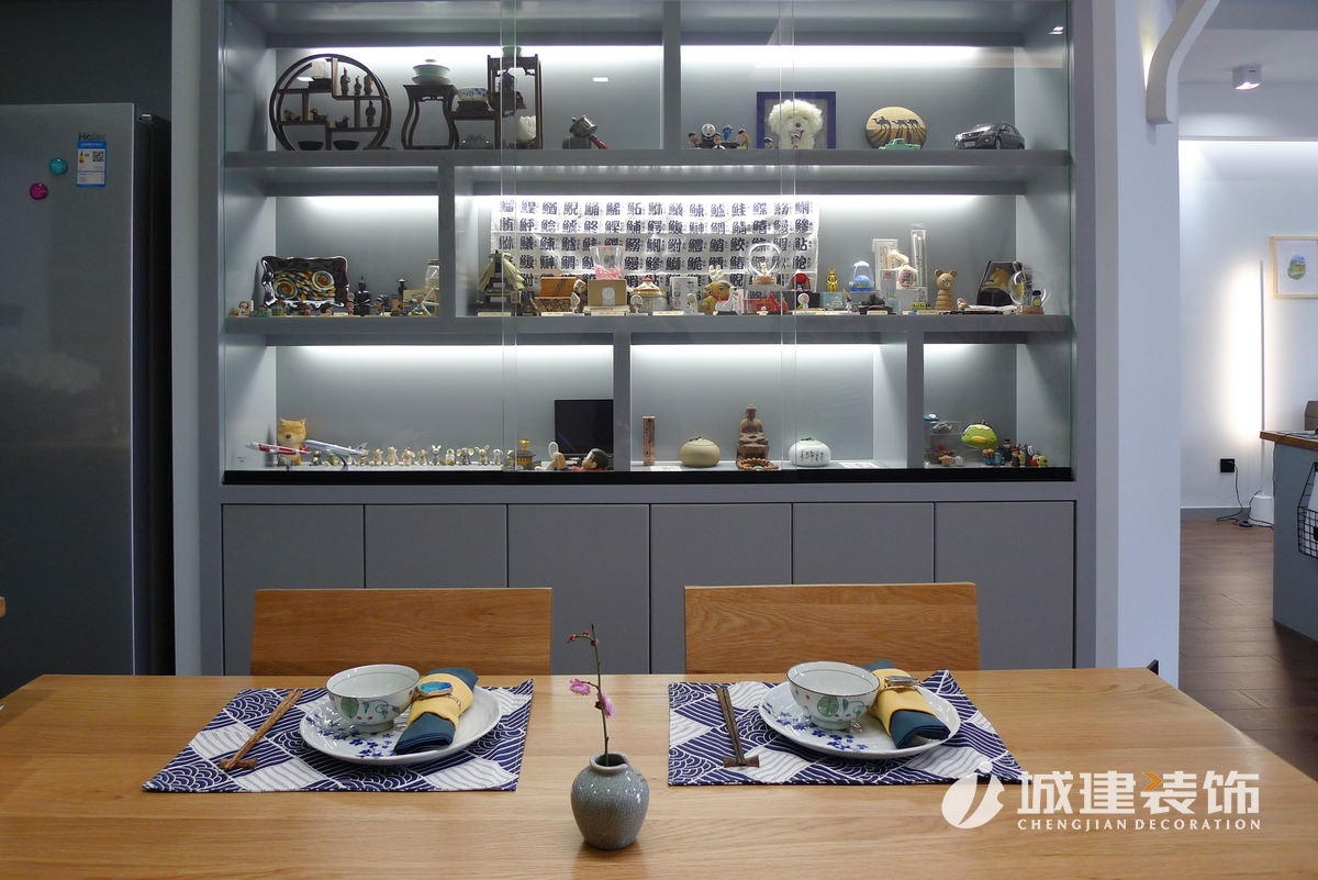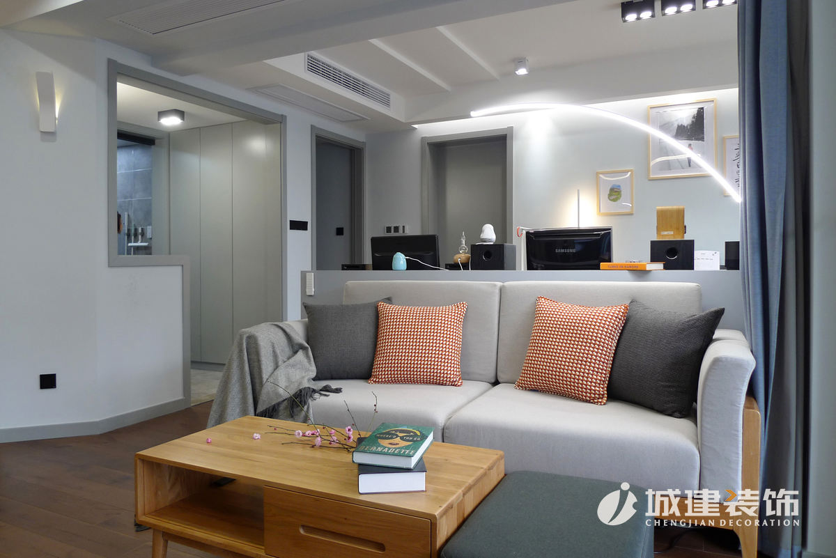 客戶是兩夫妻長期居住的房子,女主人是老師,愛好喜歡做工藝品,所以在朝南的房間單獨(dú)設(shè)計了一個工藝品的工作室,這個房型是現(xiàn)在最多的小三房戶型,我把過道換了位置,多了干區(qū)之余,工作室的空間大了,并且主臥放了1800的床的同時還有一個U字形的走入式衣柜,主衛(wèi)的空間也大了