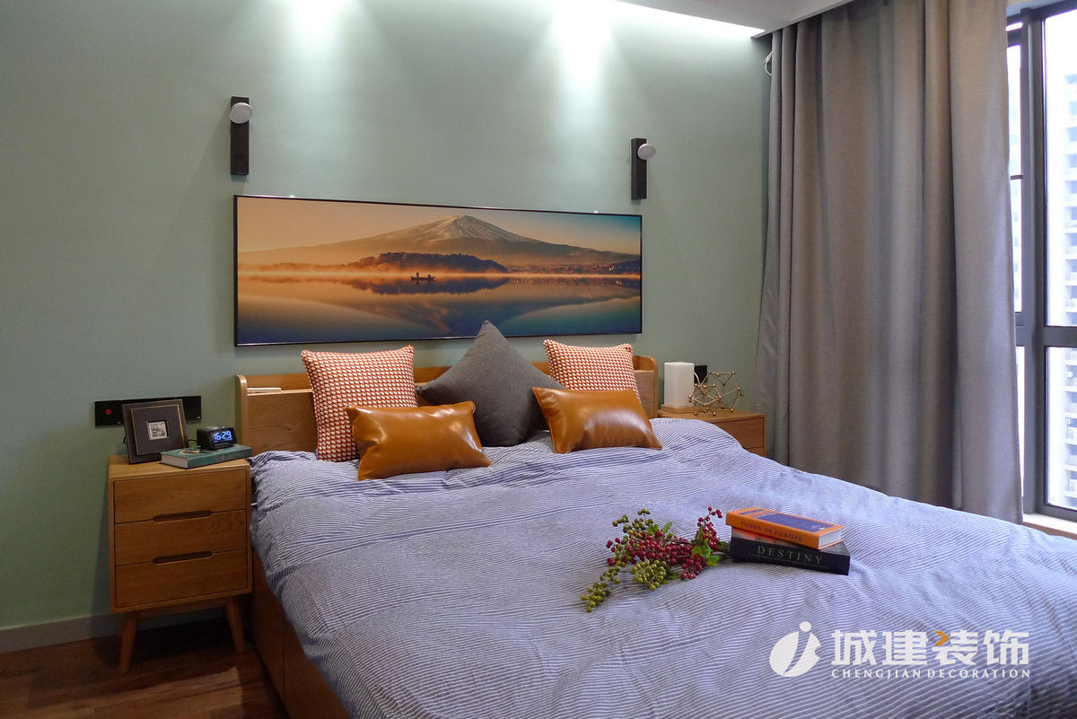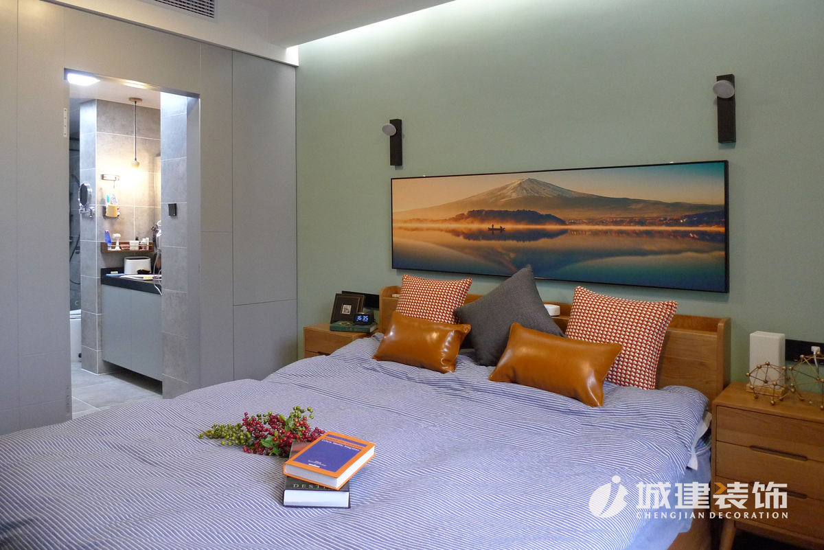 主臥的北面結(jié)合走入式衣柜門和主衛(wèi)門設(shè)計了隱形門,形成一整面背景的視覺效果