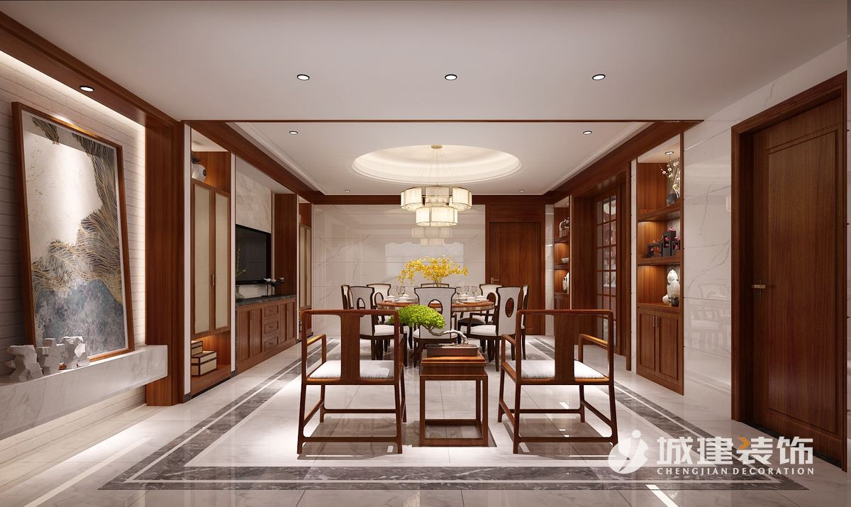 餐廳在設計上大膽的運用墻面凹凸的手法,中式的家具和勾縫大理石融為一體,濃古雅致的風韻立即撲面而來。餐廳與客廳之間的花格隔斷,造型與四個房間的門頭以及主臥床頭對陣設計呼應,典雅之中帶著幾分古樸的神秘色彩。
