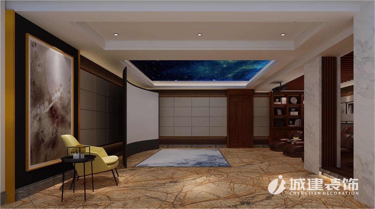 山水之道歷來是中國文人熱衷的話題,真絲硬包山水畫電視背景墻搭配大理石拉縫、沙比利實木線條、玫瑰金線條、,它在默默無言中締造出居室的文化意境。