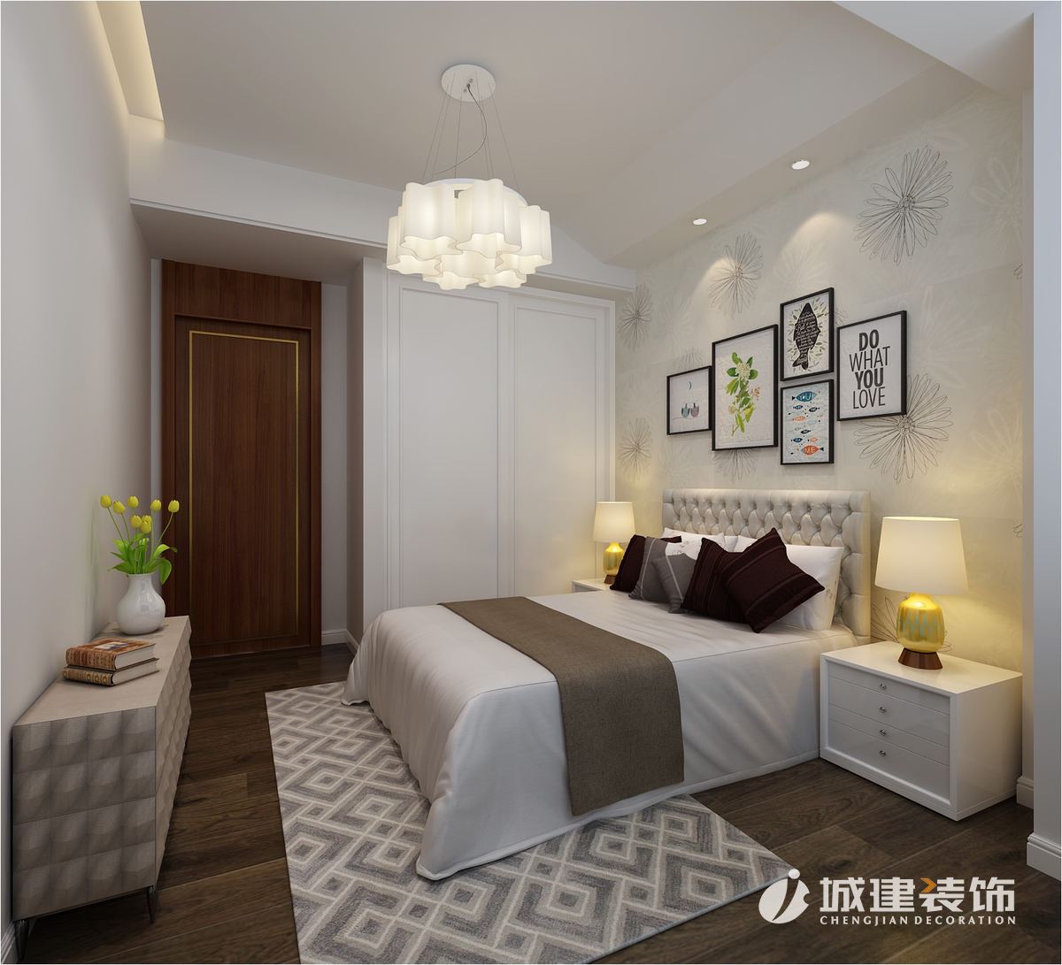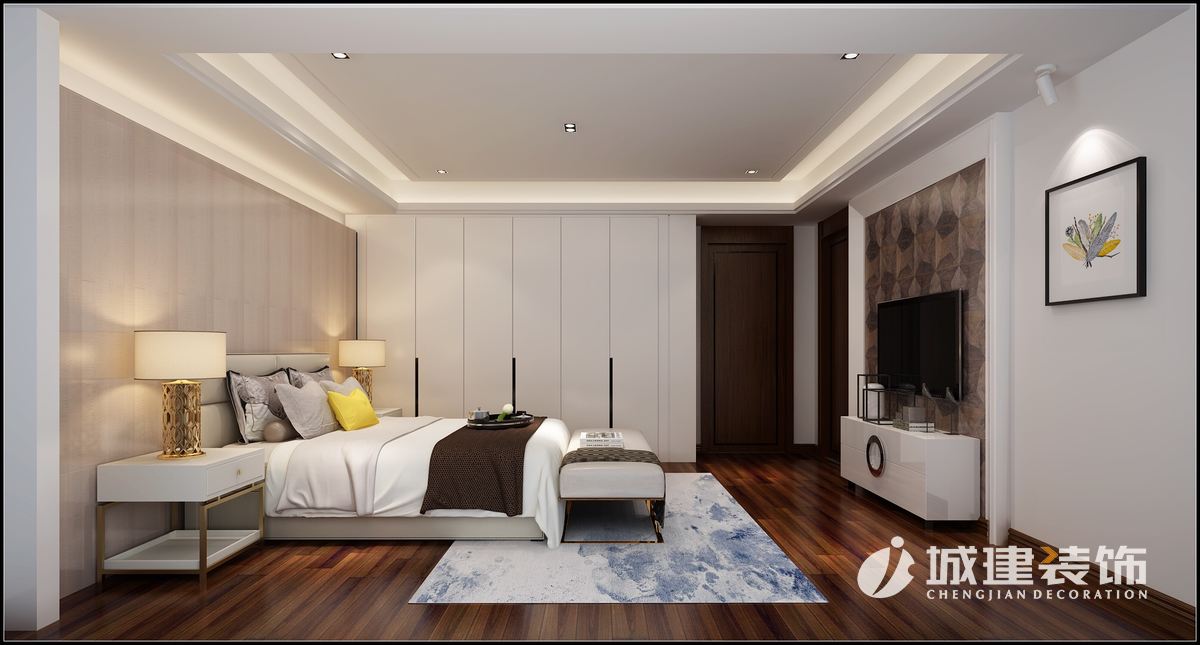 客廳電視背景運用矮墻和玻璃邊框隔斷的設計,使得干區(qū)部分采光大大的增加,運用跳色乳膠漆使整個空間時尚感,臥室也采用床頭背景運用深色乳膠漆。