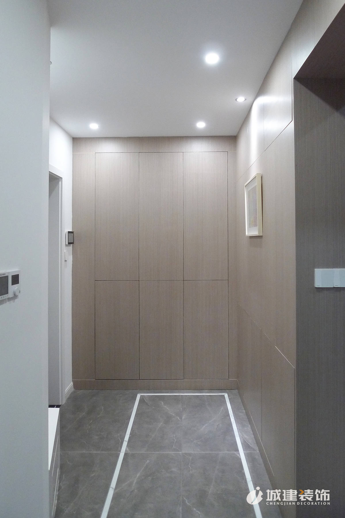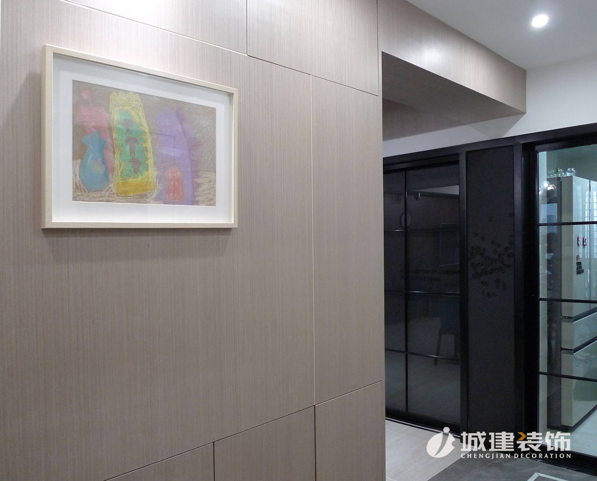 我在針對這幾點著重設(shè)計的同時,還想把每個空間的視覺延伸感增強,首先玄關(guān)左邊設(shè)計了衣帽柜,玄關(guān)對面設(shè)計了雙面柜,上半部分給餐廳做餐邊柜,下半部分給玄關(guān)做鞋柜,柜門都是以回彈隱形柜門的形式呈現(xiàn),包括成品飾面板由玄關(guān)延伸到過道頂部鋼琴位置,視覺牽引之余,也增加了視覺延伸感