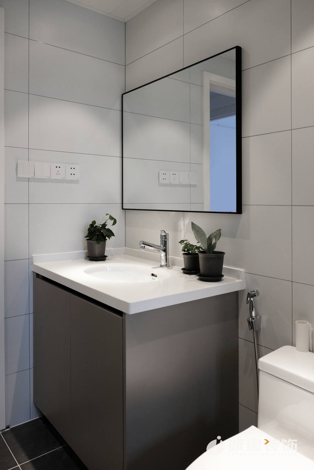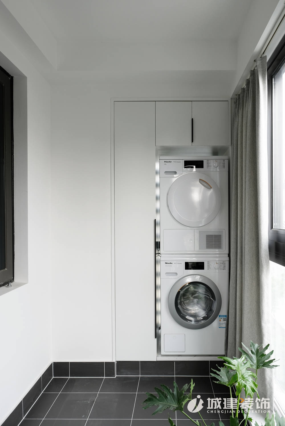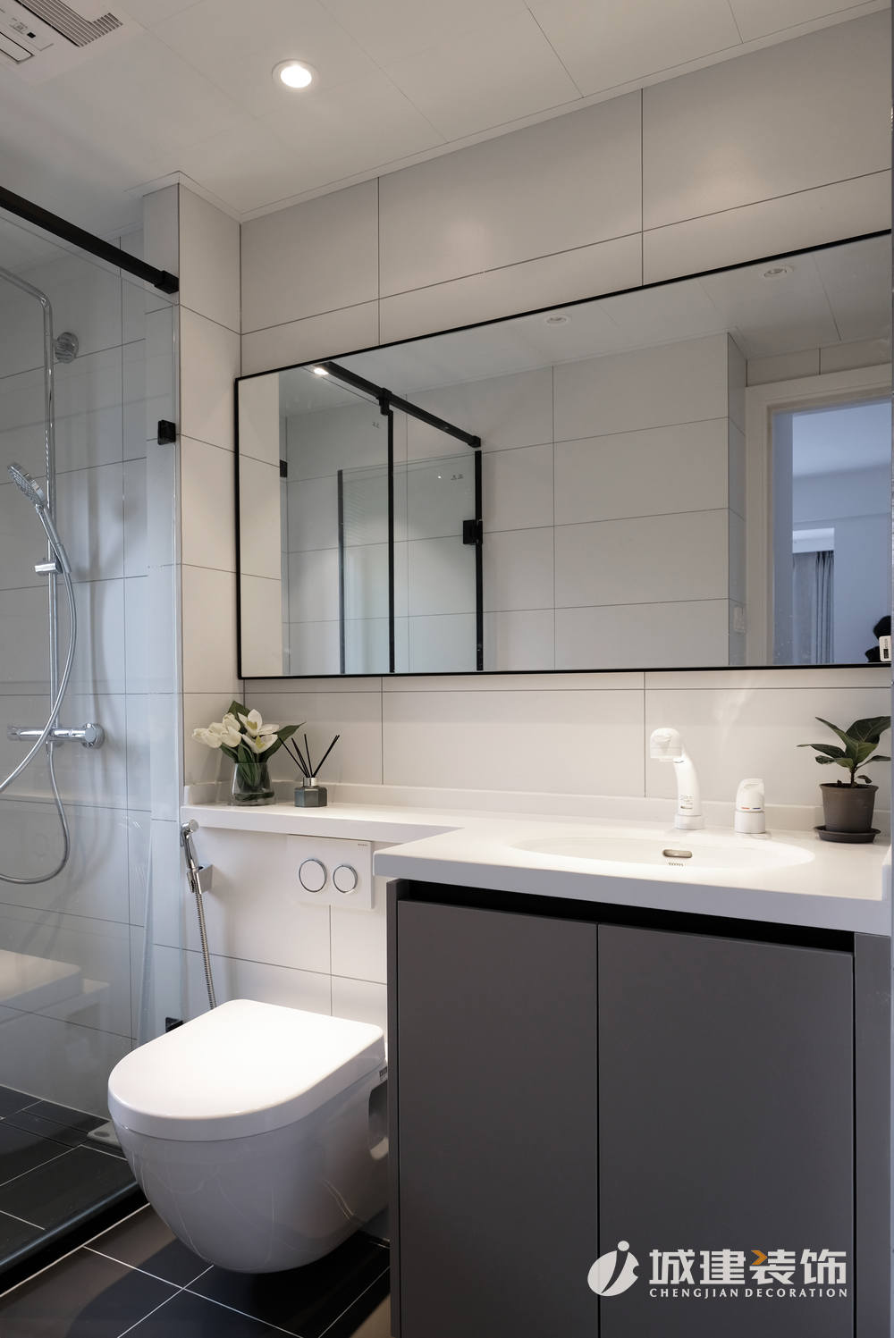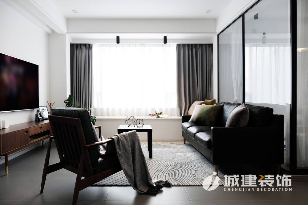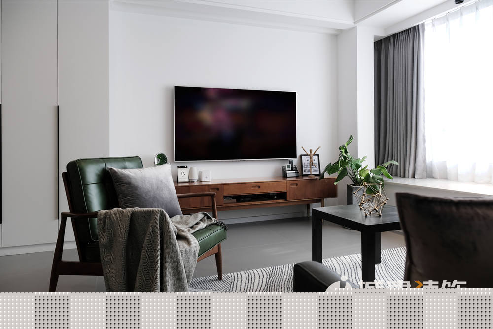 入戶右邊往里走就來到平時(shí)活動(dòng)區(qū)域——客廳。白色為主調(diào),配以灰色啞光地磚,干凈明亮??蛷d沒有選擇安裝主燈,以暗裝筒燈與明裝筒燈配合,達(dá)到空間所需光線。電視背景墻左側(cè)做了一列儲物柜,滿足日常儲物的同時(shí),亦作為玄關(guān)與客廳之間的一個(gè)過渡;沙發(fā)選擇皮質(zhì),墨綠色與黑色的撞色搭配,空間質(zhì)感立即顯現(xiàn);