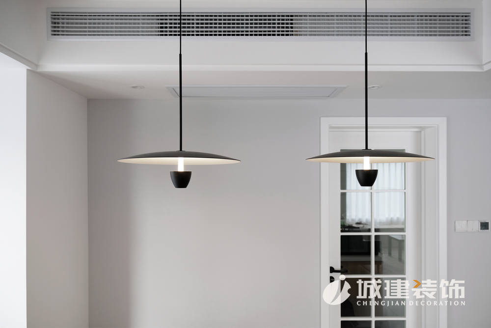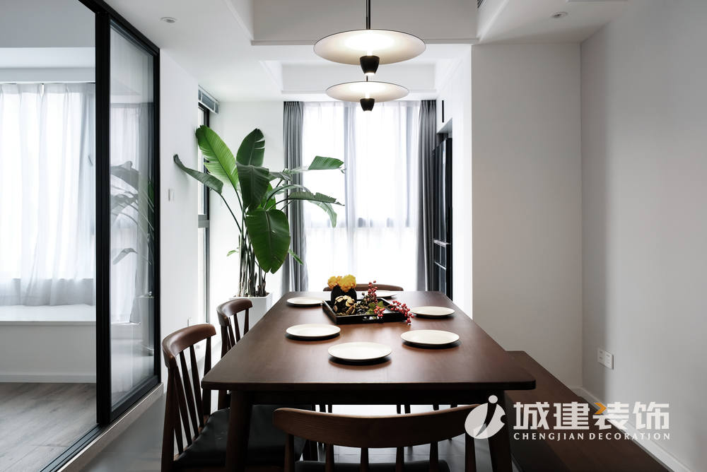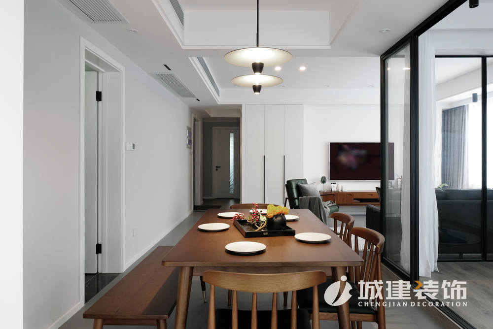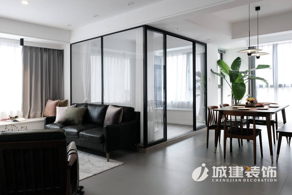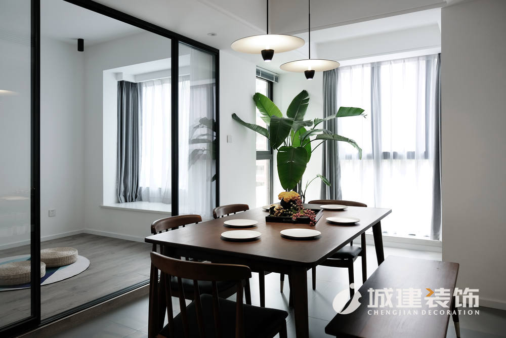 客廳再往里走即是餐廳,簡約自然的北歐餐桌,桌椅的圓角柔和了直線條的空間,選擇吊燈裝飾,更顯溫馨;客廳右上角隔出一間多功能間,為保證其與客餐廳的光線充足,做成玻璃房,鋪設(shè)地板,這樣女主人平時(shí)可以在這里練練瑜伽,看看書、與朋友喝喝茶。