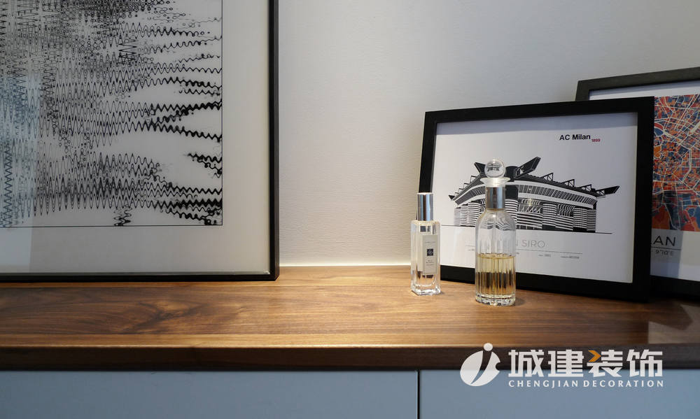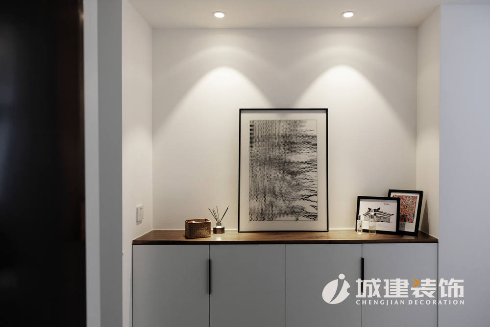 本案在原始結(jié)構(gòu)上并沒有做大改動(dòng),入門玄關(guān)處屬于客廳與臥室之間的過道,比較窄,為了不讓該空間顯得壓抑,做了簡約的白色玄關(guān)柜,用木飾板做臺面,搭配藝術(shù)裝飾畫,簡單有格調(diào)。
