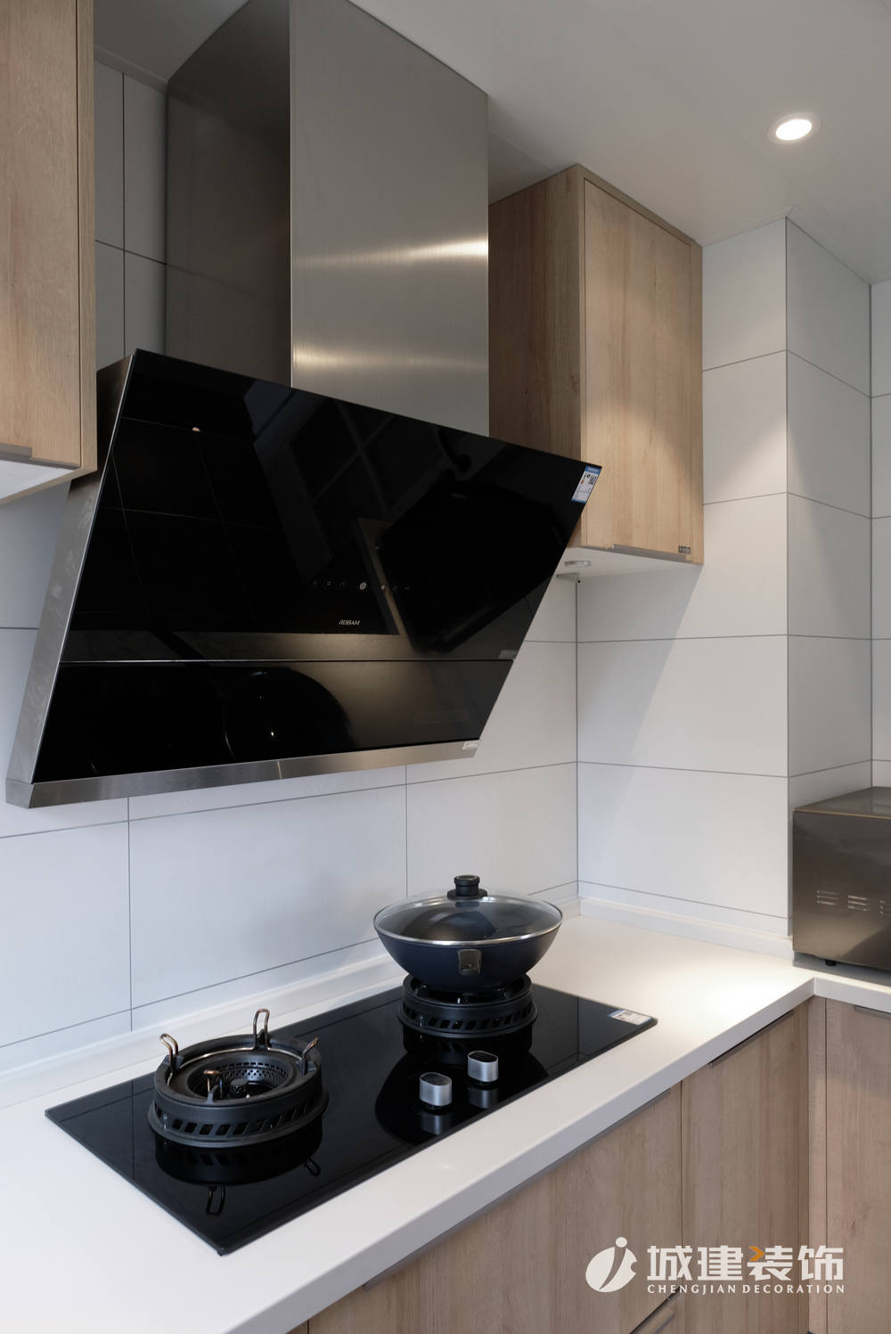 餐廳旁邊即是廚房,依然選擇白色主調(diào),搭配原木色櫥柜,清新自然。