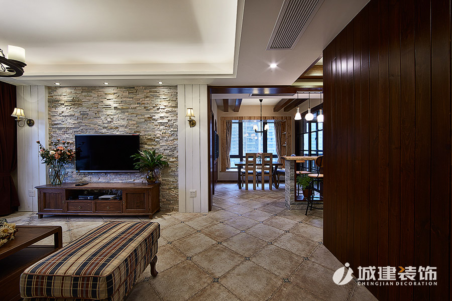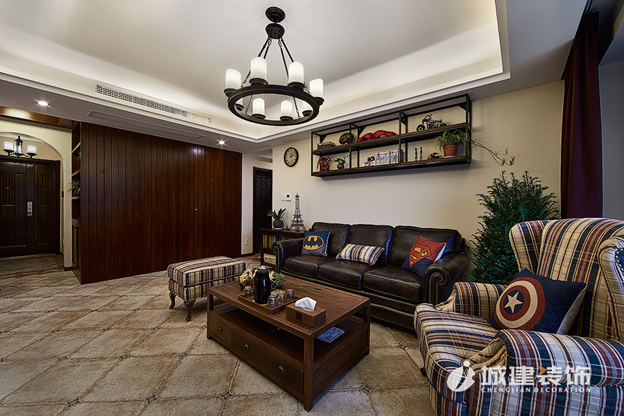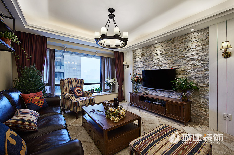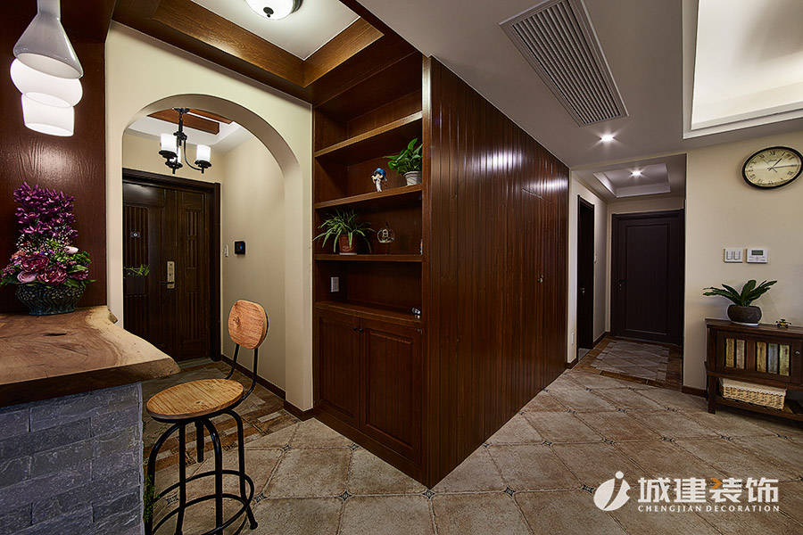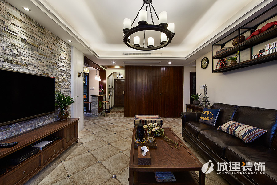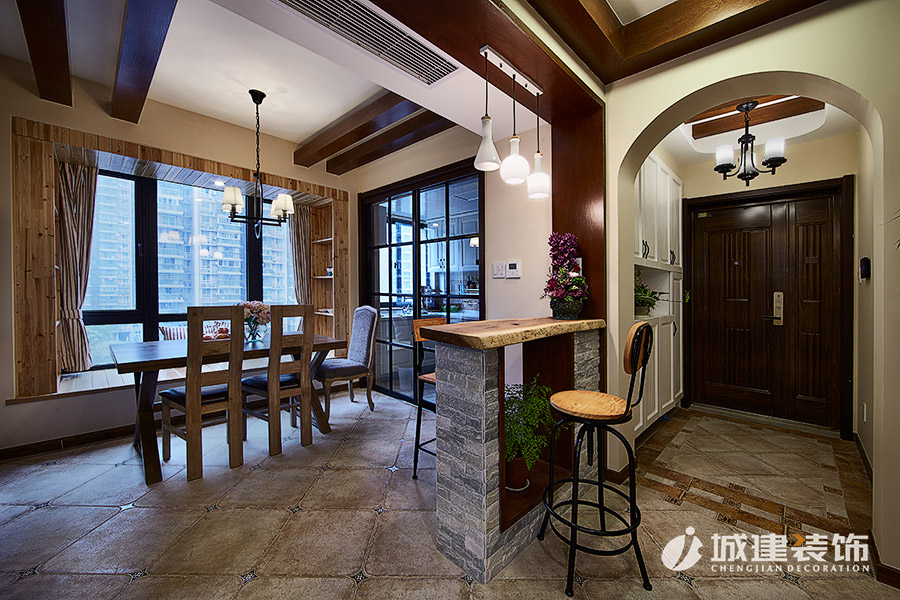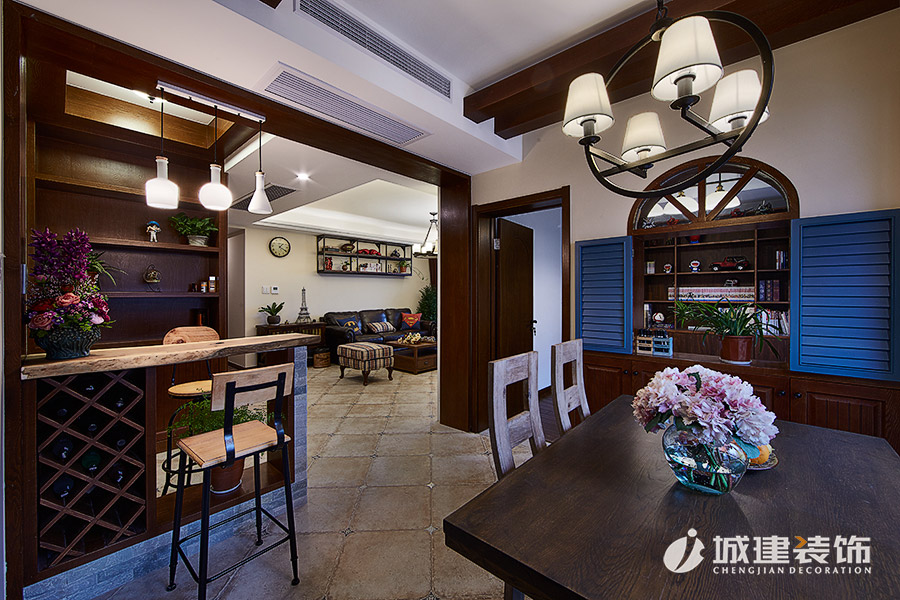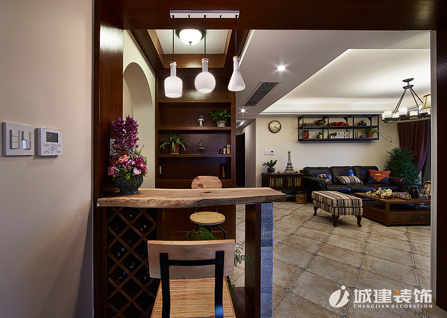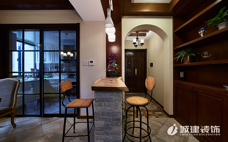 本案采用溫馨小美風,無論是客廳處的或皮質(zhì)或布藝的沙發(fā),還是做舊造型的沙發(fā)柜,電視背景墻和玄關處酒柜吧臺的石材裝飾,時尚個性燈具,鐵藝木質(zhì)結(jié)合的吧臺椅,無不體現(xiàn)浪漫的美式情懷,整體風格也達到極致完美的統(tǒng)一融合。