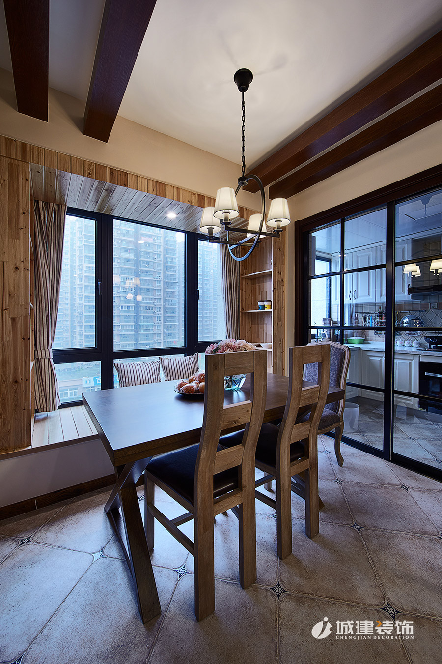 書房連接餐廳處別出心裁地設計了室內(nèi)窗,餐廳作為延伸點向左向右,使得書房、廚房三處連通一線,整片區(qū)域在視覺上達到了延伸。