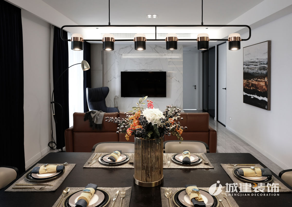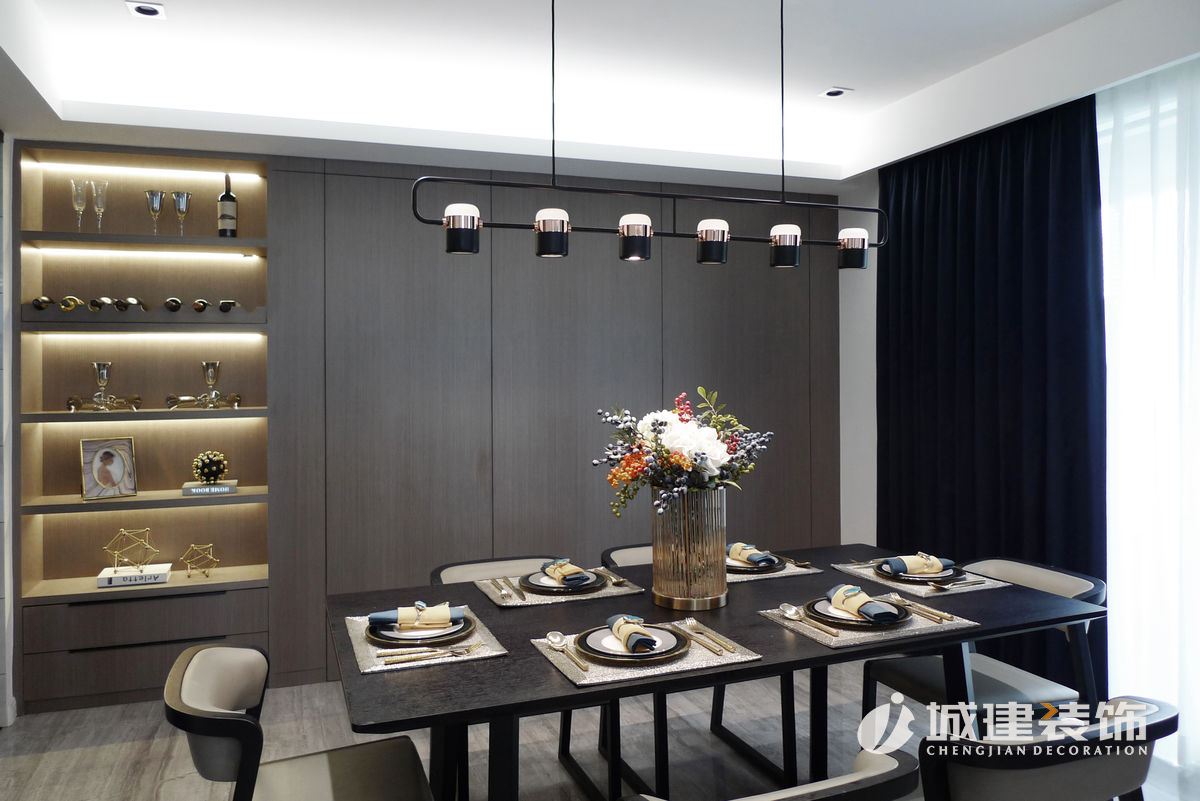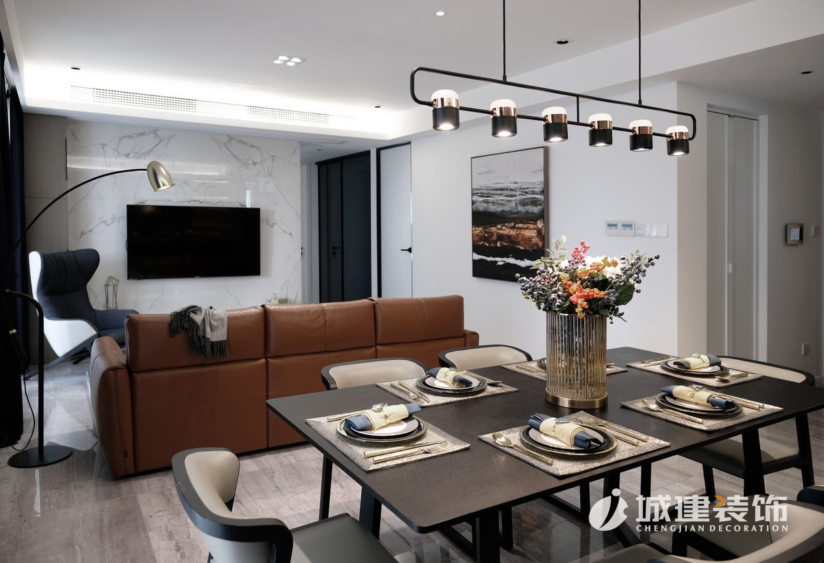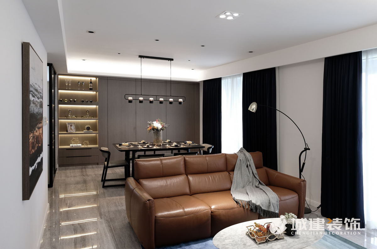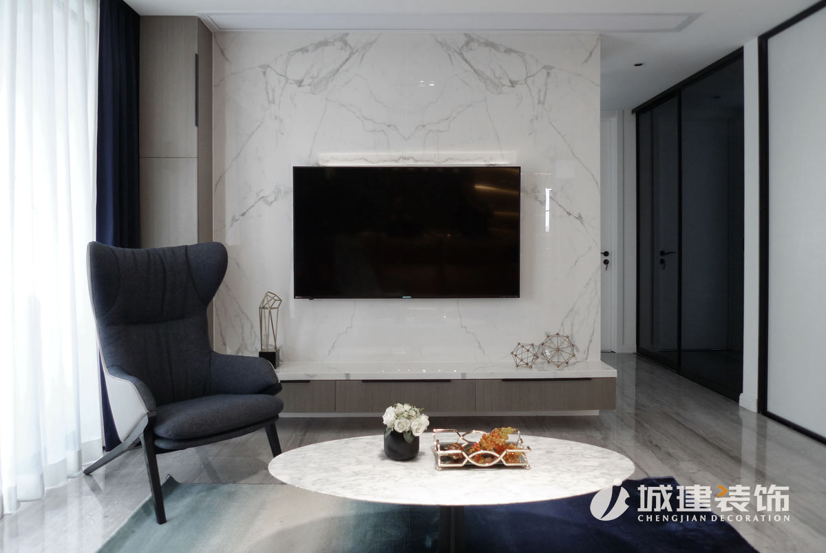 戶型設計考慮通透性,客餐廳之間的結合在一起,包括和陽臺的一個連通性。背景面的處理考慮石材和木飾面的結合,搭配灰色系的石材地面,讓整個空間看起來干凈清爽。