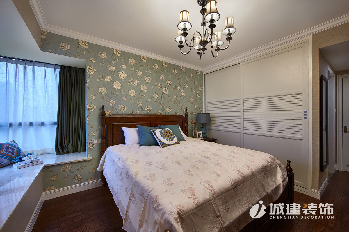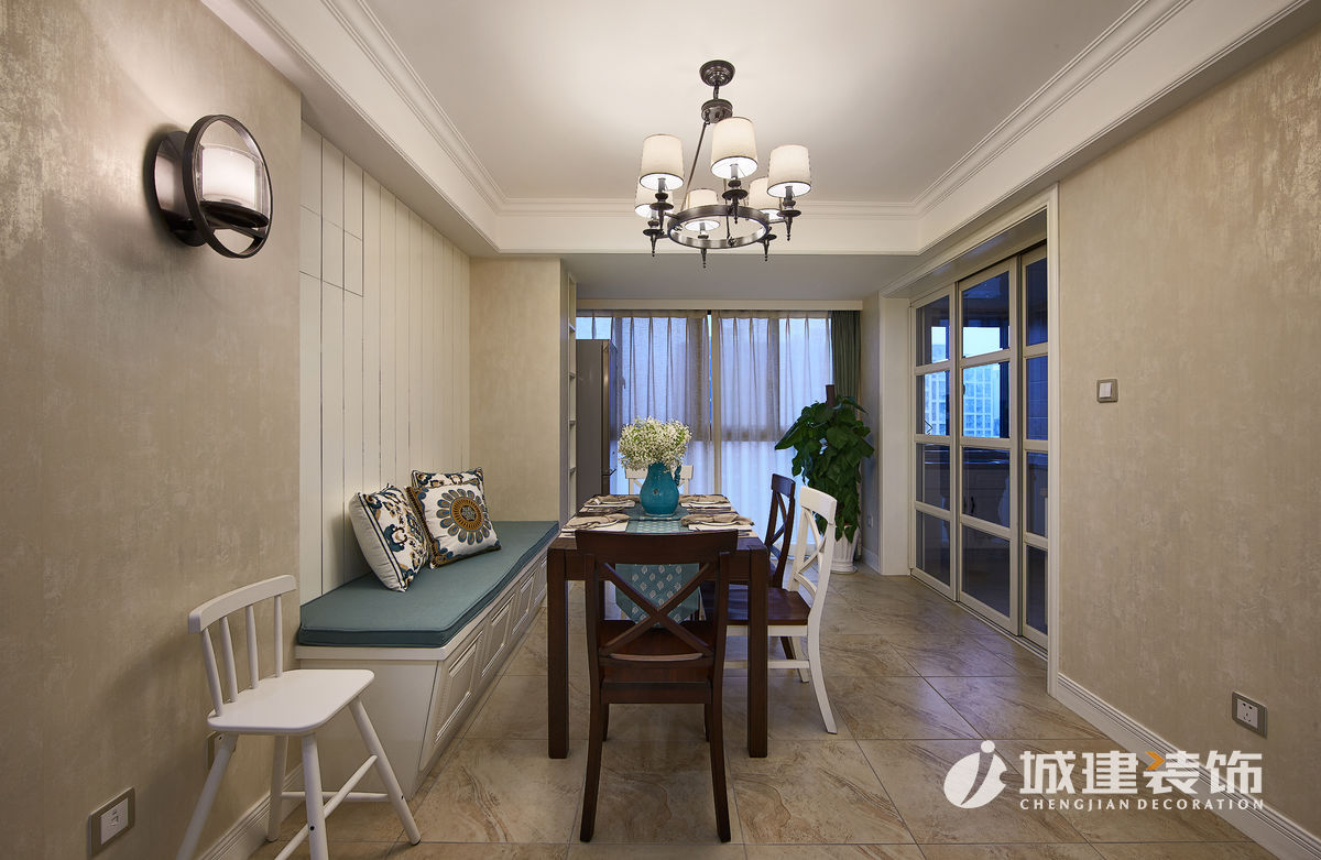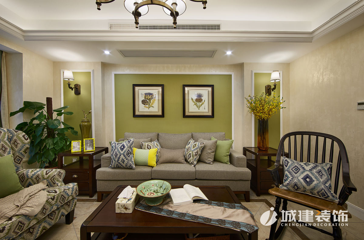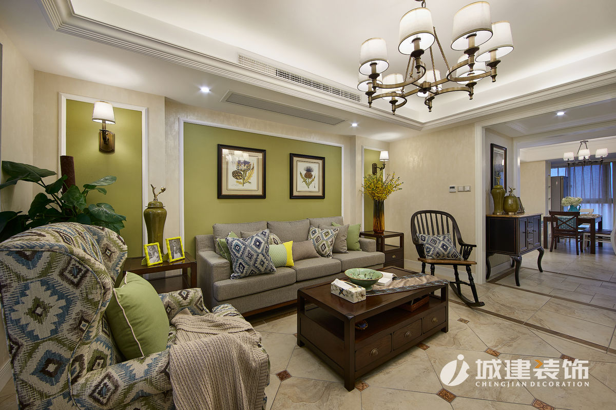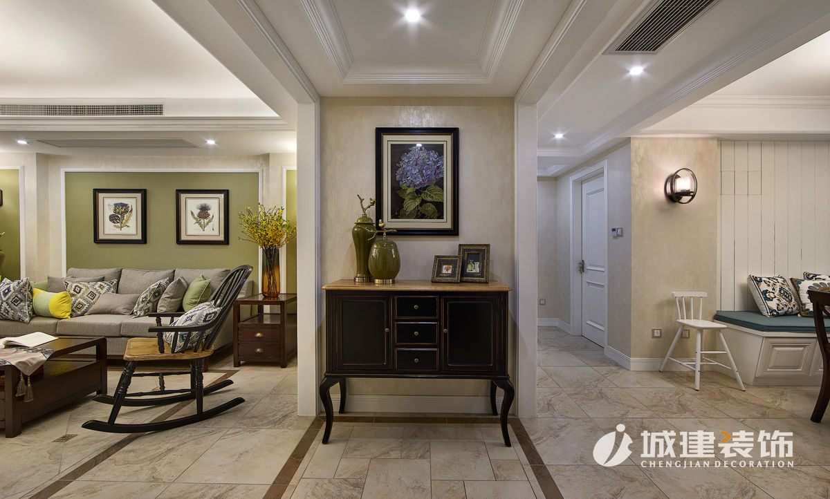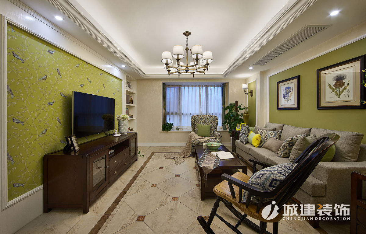 本案采用簡美風(fēng)格??蛷d選擇草綠色與米色搭配,自然清新,溫馨滿滿;餐廳將陽臺納入,因為原先一堵承重墻,選擇卡座設(shè)計,讓空間線條自然過渡;廚房白色美式櫥柜與黃色復(fù)古磚,干凈明亮;臥室根據(jù)家庭成員,選擇不同風(fēng)格壁紙,顏色皆選擇低飽和度,靜謐溫馨。