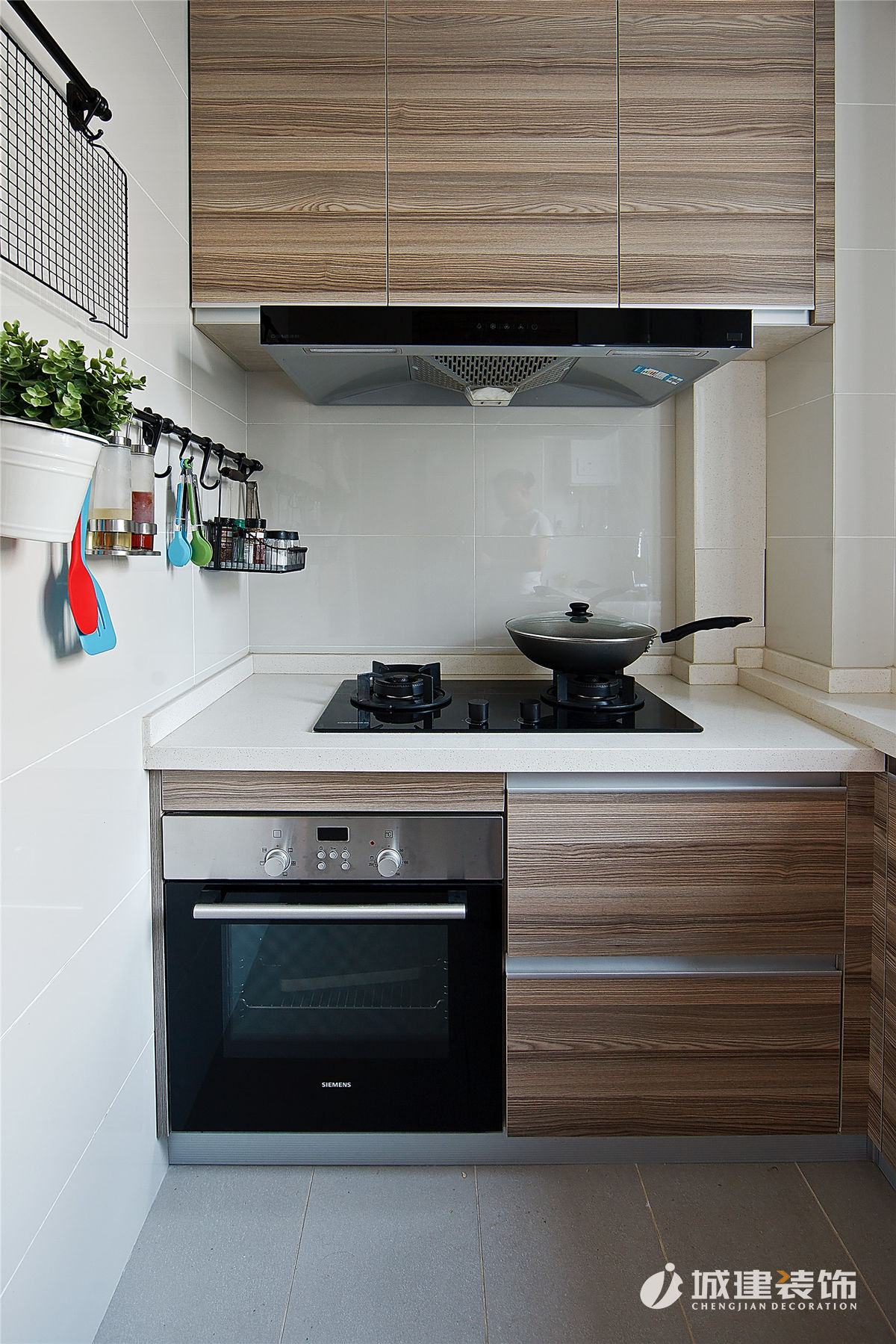 整個(gè)空間在細(xì)節(jié)設(shè)計(jì)上也有不少的改動(dòng),入戶正對(duì)面,增設(shè)了玄關(guān)造型墻,木色儲(chǔ)物柜搭配小清新圓型裝飾畫,擺放上主人家深愛的小吉它,仿若有曼妙的音樂娓娓而來。