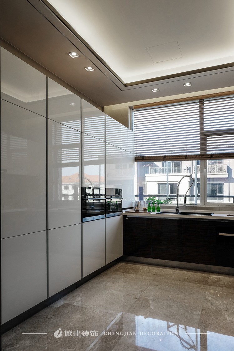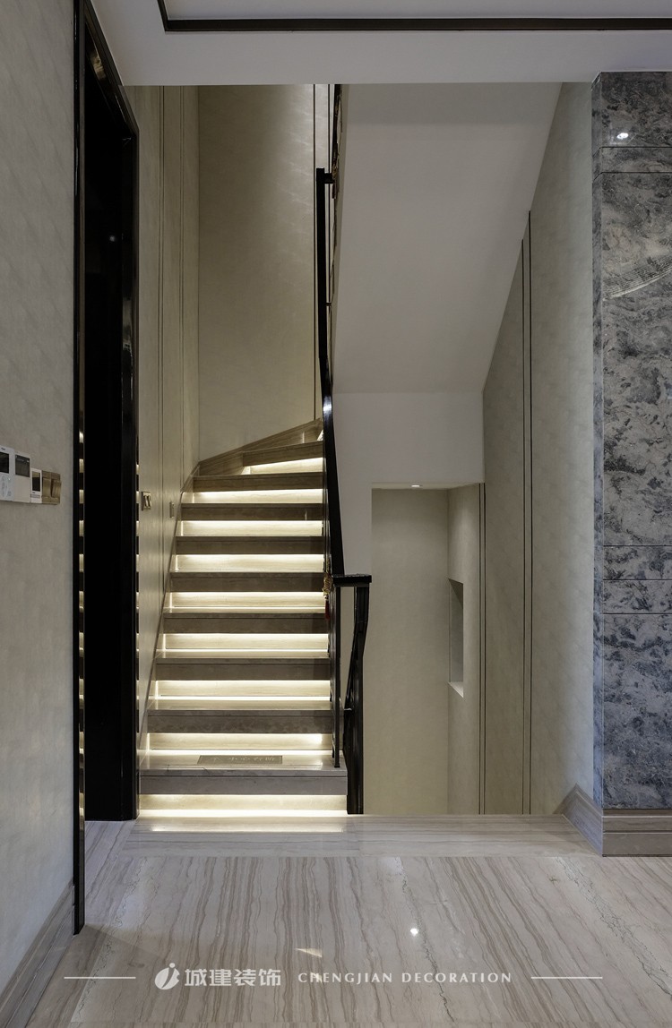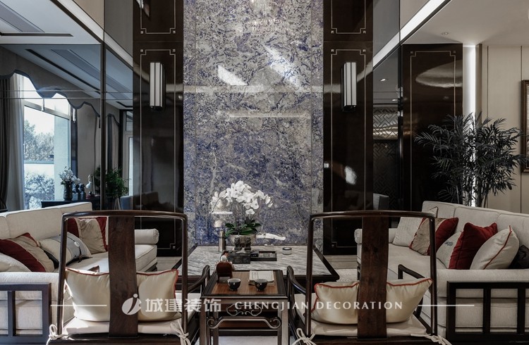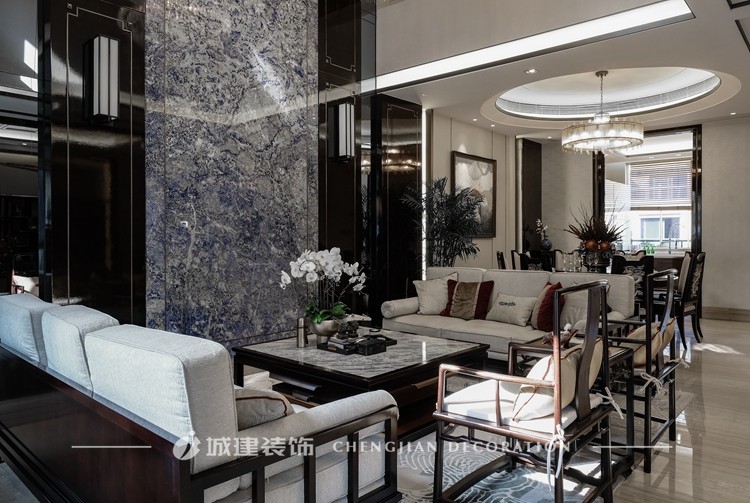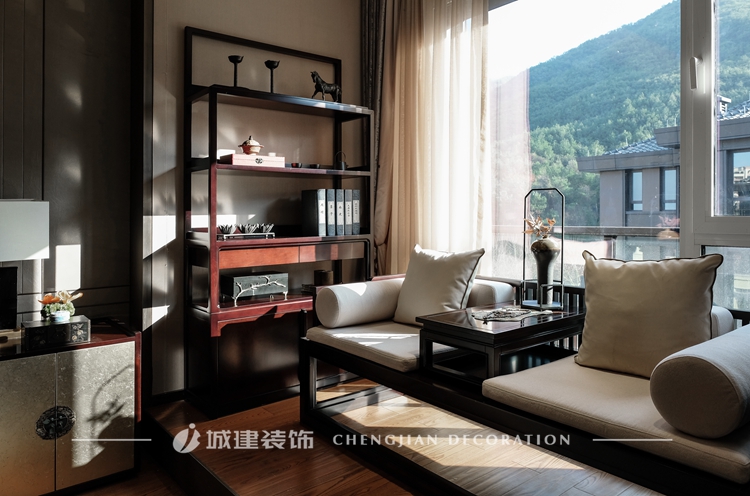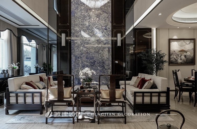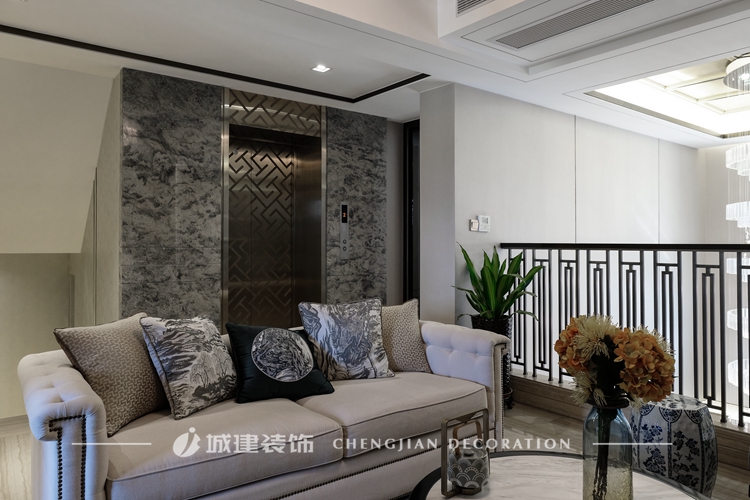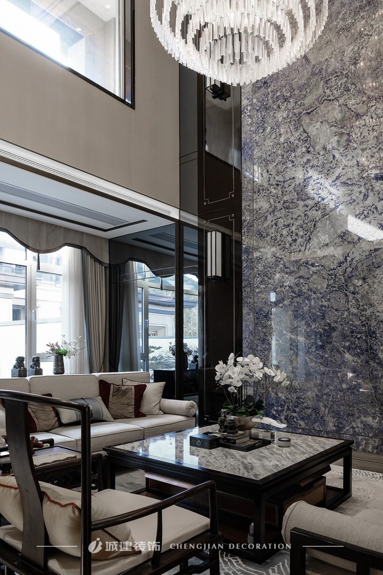本案空間配色呈現(xiàn)出清雅含蓄、端莊風(fēng)華的東方之美,躍層挑高的客廳開(kāi)闊大氣;