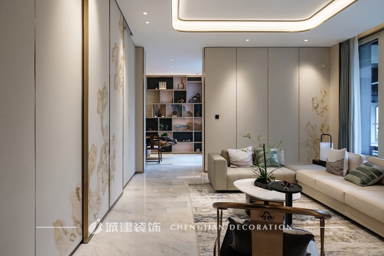 從院內(nèi)走進(jìn)一樓會(huì)客廳,實(shí)虛相間的立式屏風(fēng),