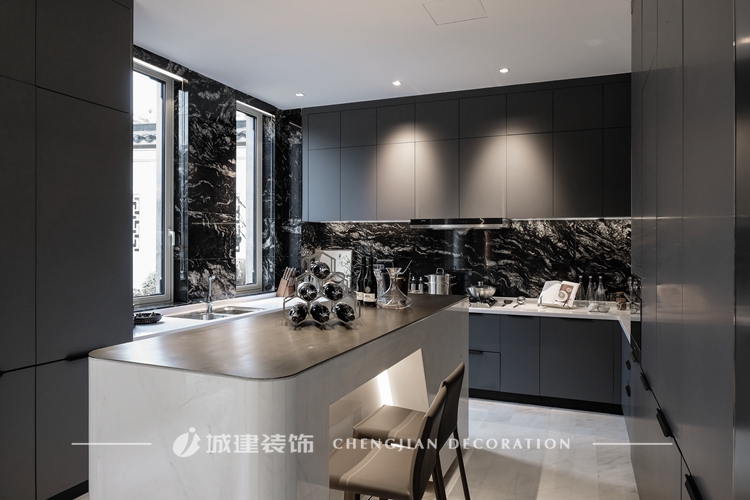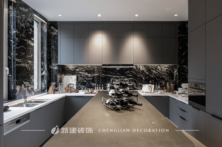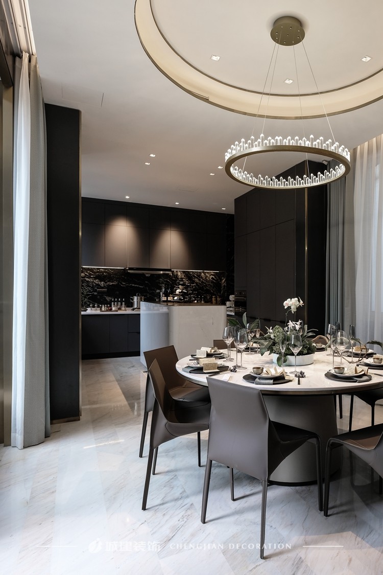 灰色柜門與餐廳統(tǒng)一,如潑墨般的黑底白紋墻面,磅礴大氣,奢華逼人。