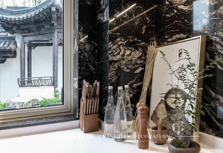 當(dāng)柜門關(guān)上,中間部分巧思設(shè)計(jì),圓形的造型里是假山的一角,