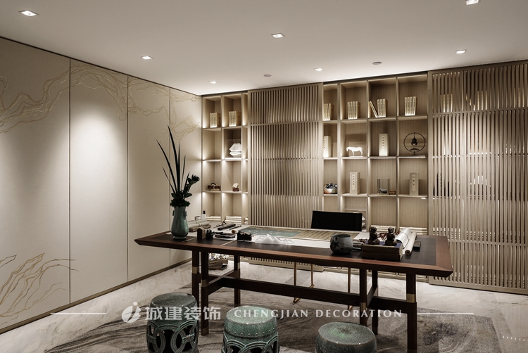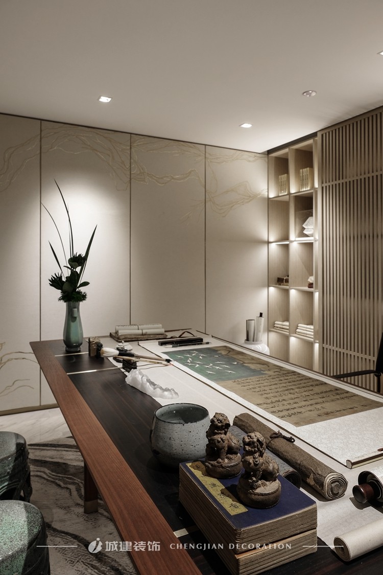 書房氛圍古色古香。素雅的木色書架,柜門就像展開(kāi)的竹簡(jiǎn);