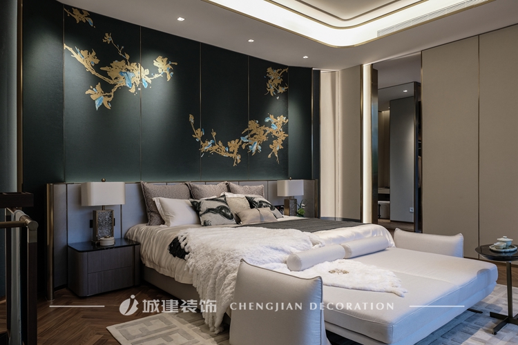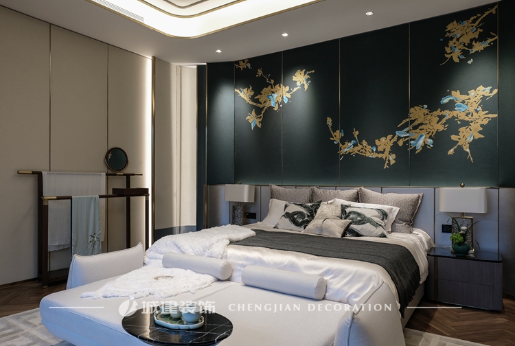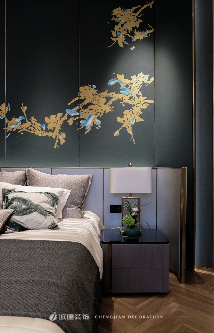 主臥環(huán)抱式床頭,讓睡眠更安心;墨綠色花卉背景墻,雅致韻味濃;