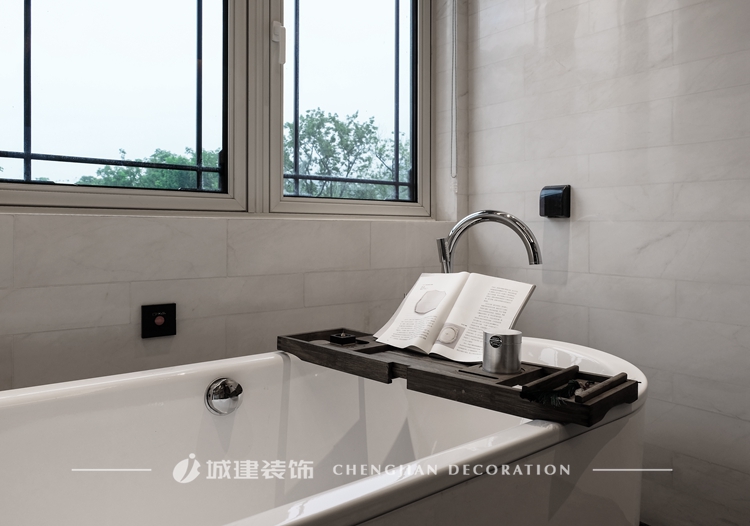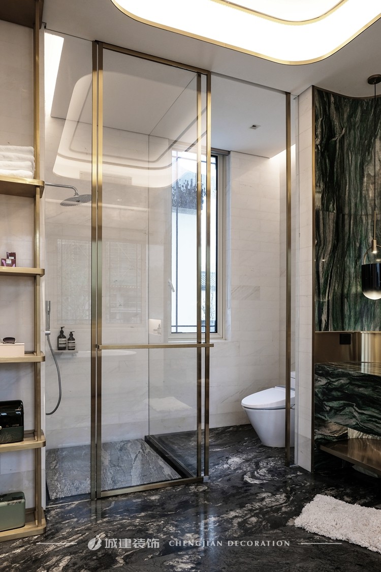 經(jīng)過(guò)開(kāi)放式衣帽間走進(jìn)主衛(wèi)。洗漱臺(tái)墨綠色大理石與主臥相呼應(yīng),配上金屬包邊,雍容華貴;