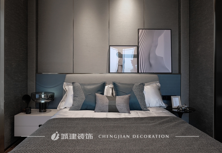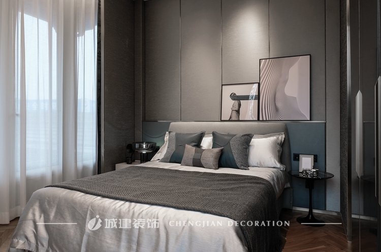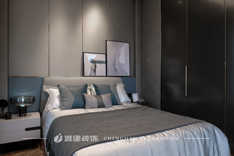 次臥更偏現(xiàn)代,依然環(huán)抱式床頭,給足安全感。深灰色的空間,以灰藍(lán)色點(diǎn)綴,前衛(wèi)時(shí)尚;