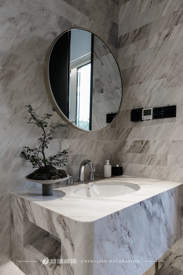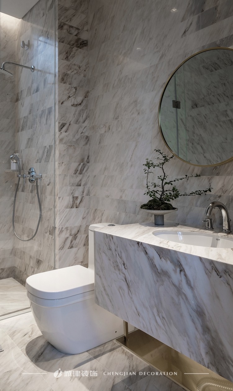 次衛(wèi)全空間爵士白大理石不規(guī)則鋪設(shè),極簡(jiǎn)設(shè)計(jì),時(shí)尚大氣。