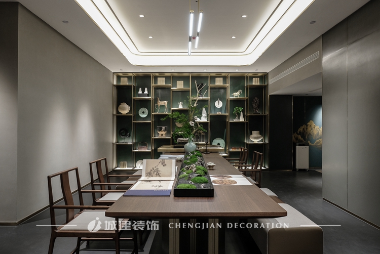 水墨畫元素點(diǎn)綴于墻面,不刻意,不張揚(yáng),如涓涓細(xì)水,讓中式的詩(shī)情畫意、平緩靜逸在空間里自然宣泄。