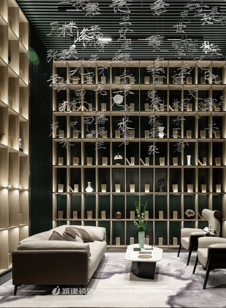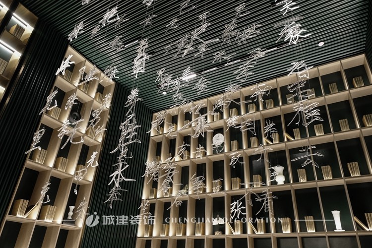 頂面懸掛透明亞克力材質(zhì)的漢字掛飾,當(dāng)光線從不同角度投射下來(lái),實(shí)虛之間,領(lǐng)略中華漢字之美。