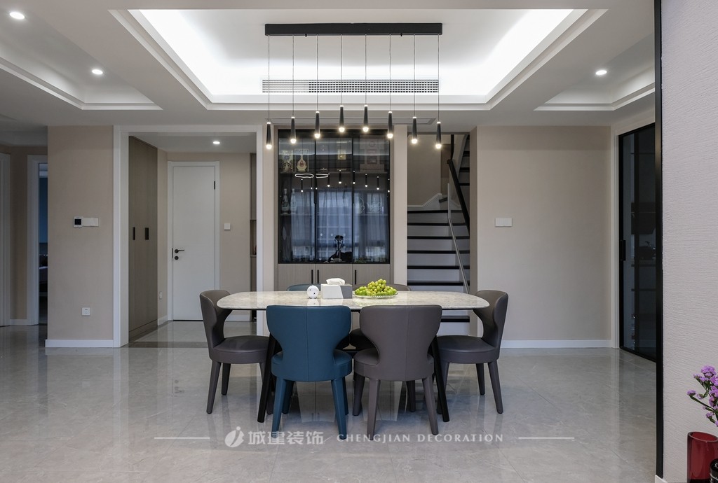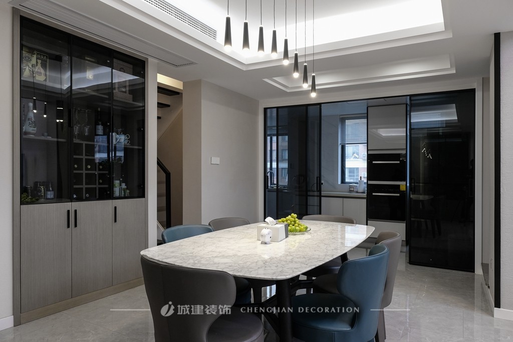 湖藍(lán)跳色餐椅為灰色調(diào)的克制空間增添靈動(dòng)