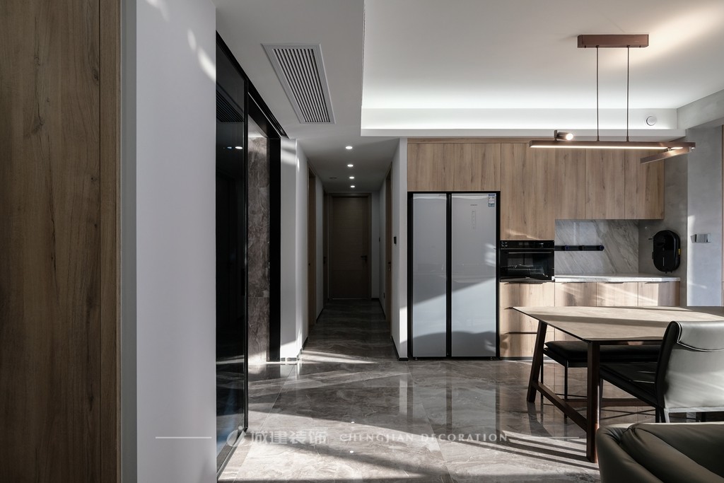 入戶后是一條寬1m,長近3m的玄關(guān)過道,左側(cè)一排鞋柜滿足日常所需,設(shè)計換鞋凳出入很方便;右側(cè)頂部設(shè)計隱藏式燈槽,光線柔和,更有氛圍感。