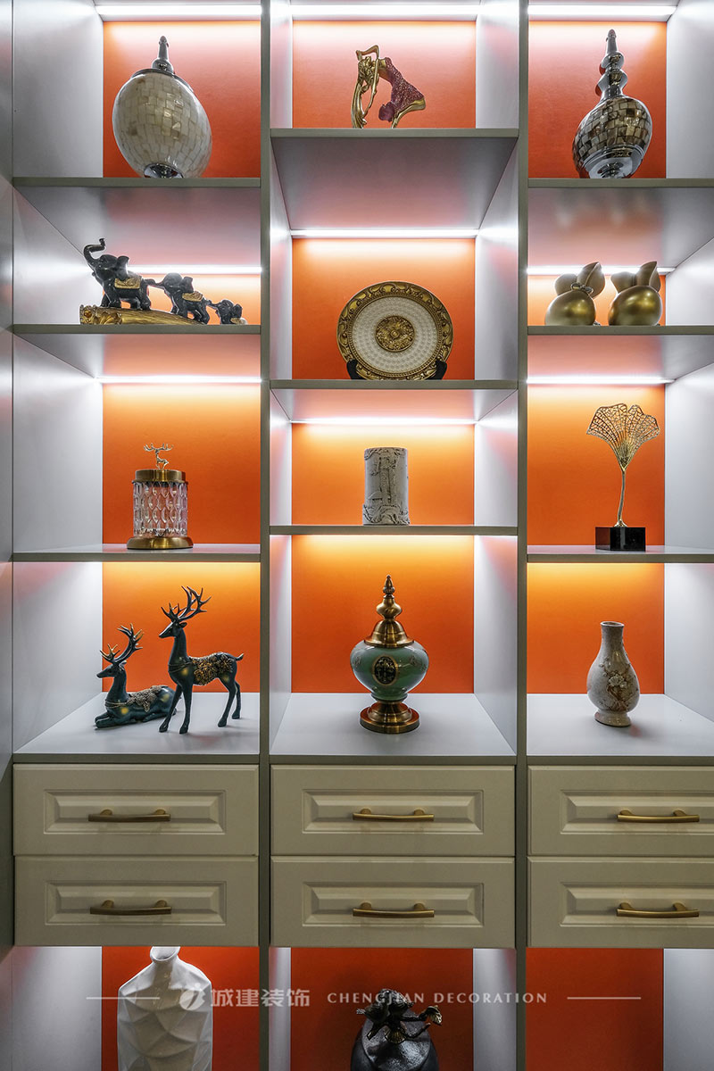 金屬元素的輕奢點(diǎn)綴以及水晶吊燈折射的璀璨,營(yíng)造了一個(gè)浪漫精致的美學(xué)空間。