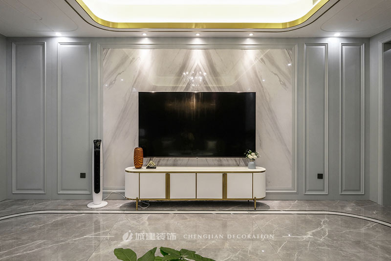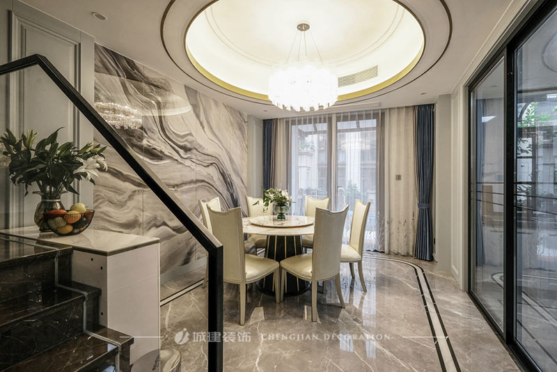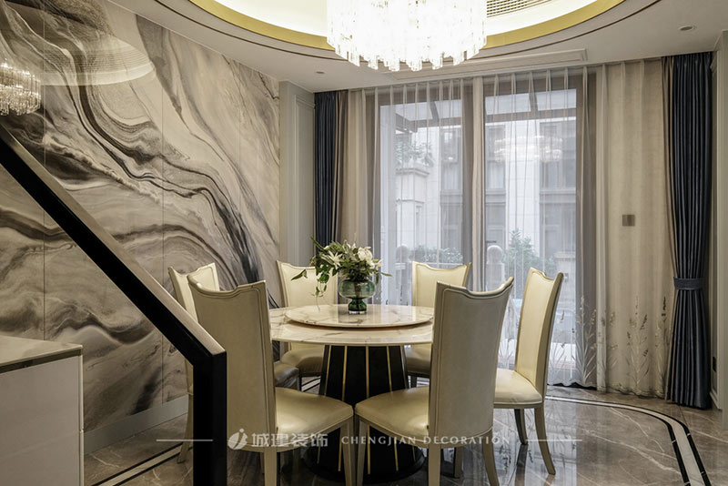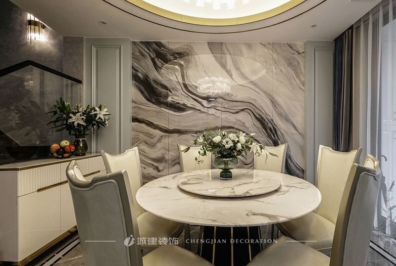 餐廳,大理石背景墻奢華大氣;圓餐桌、圓吊頂讓硬朗的空間變得柔和,圍合的用餐方式更顯溫馨。