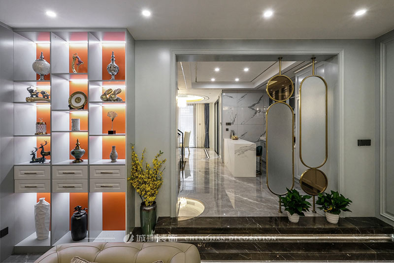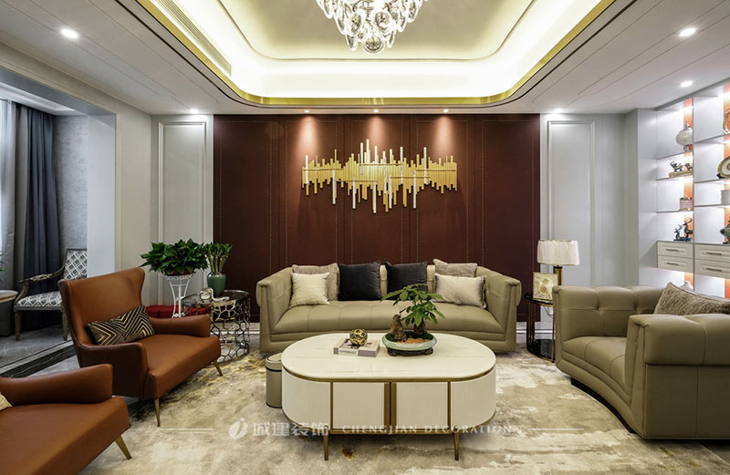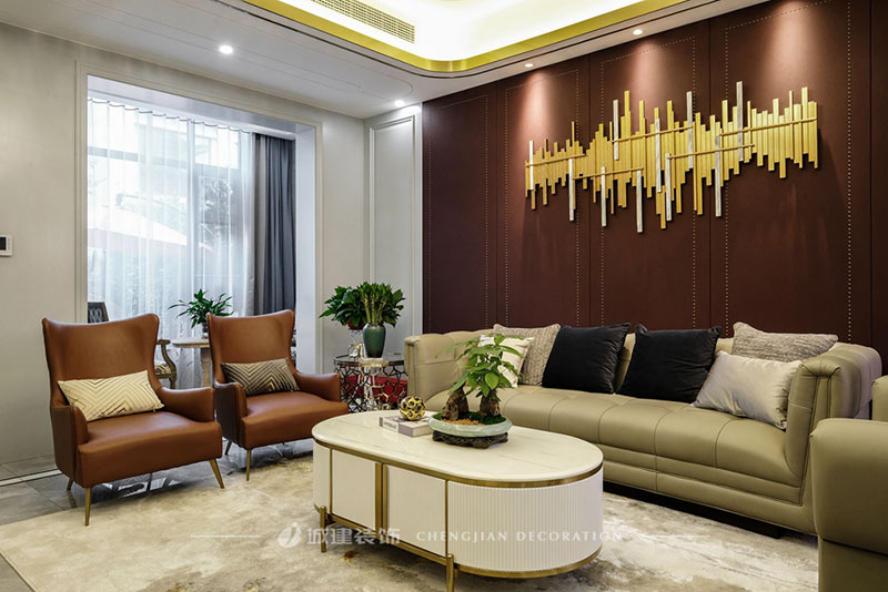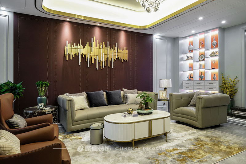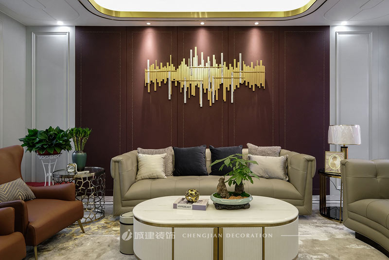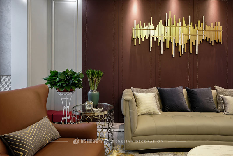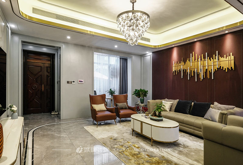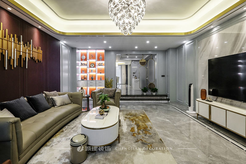 一進(jìn)門,以淺灰色為主基調(diào)的理性空間,加入了高貴優(yōu)雅的酒紅色,內(nèi)斂的奢華氣質(zhì)撲面而來(lái);